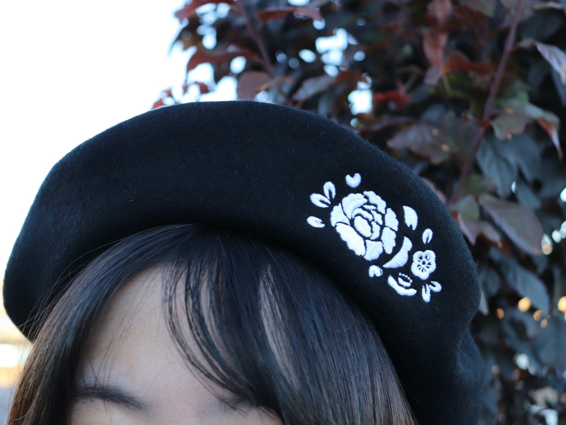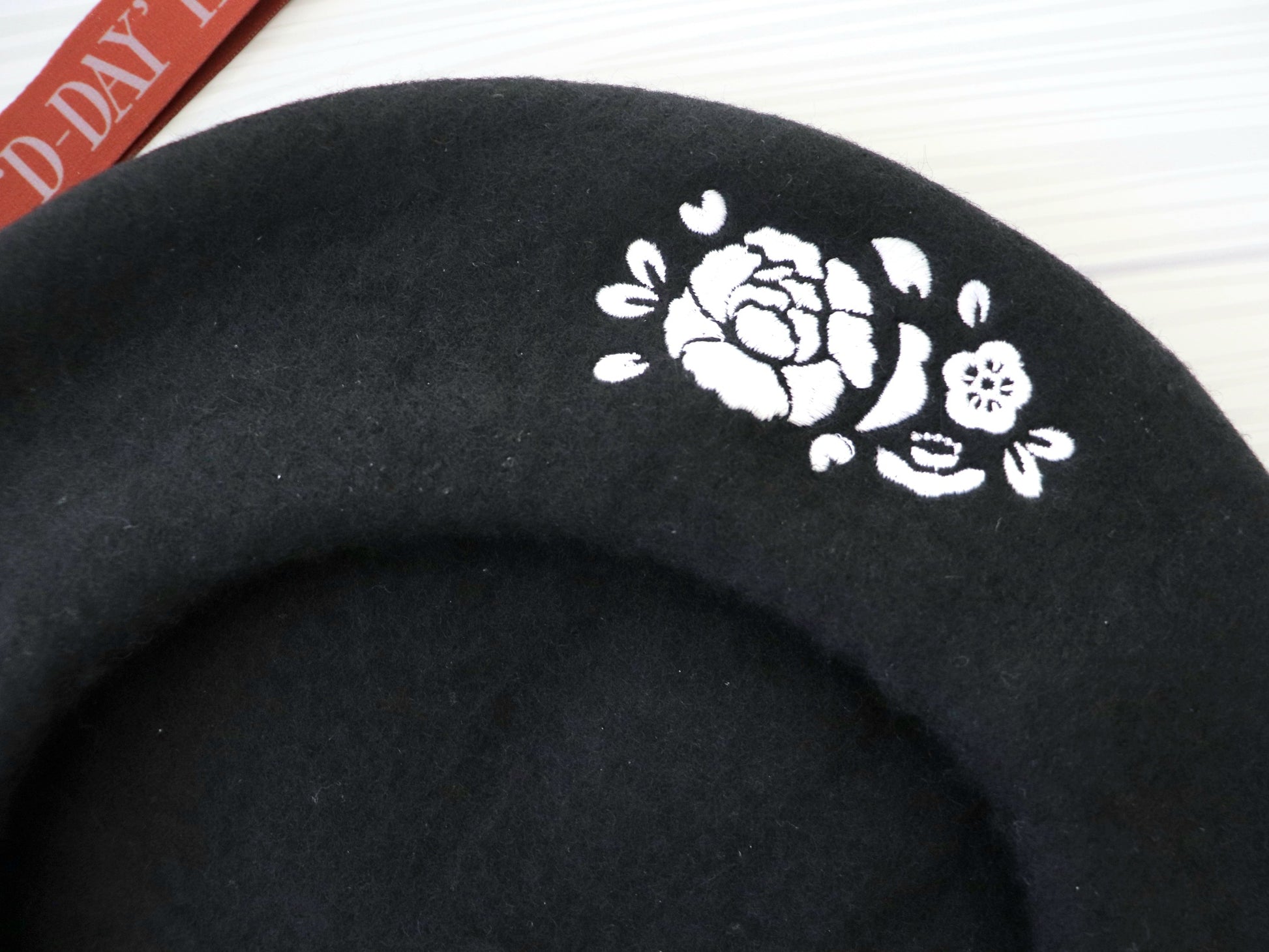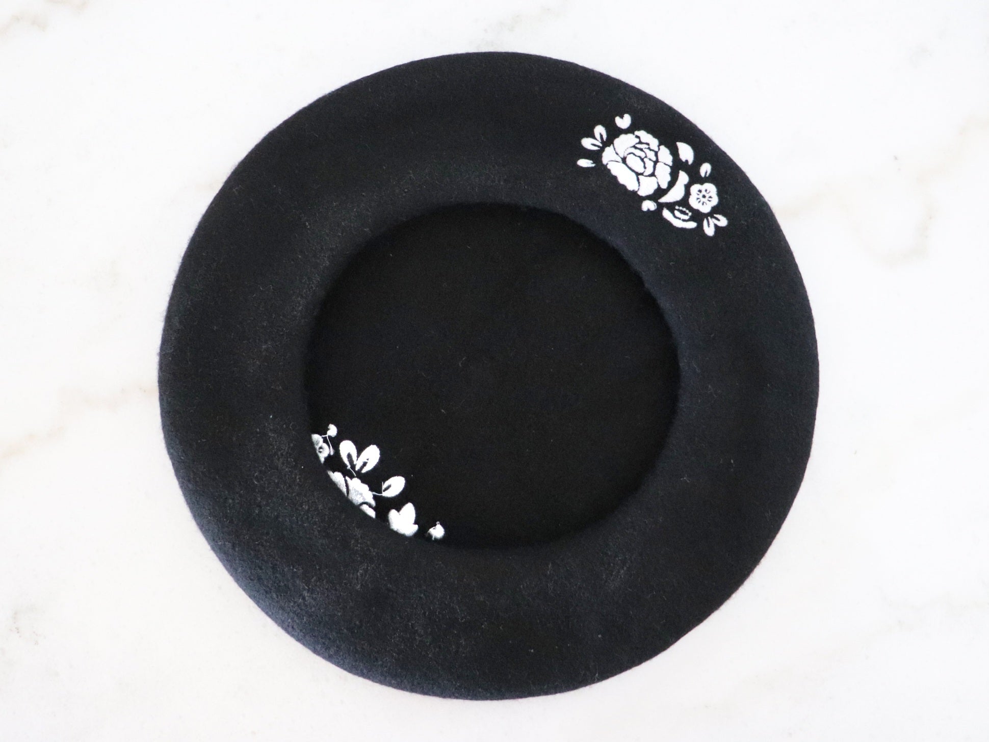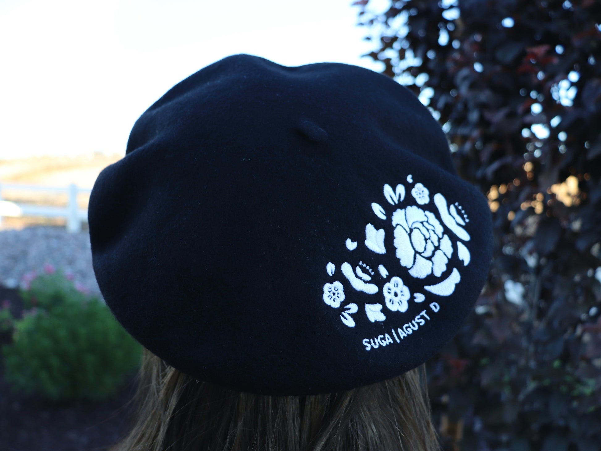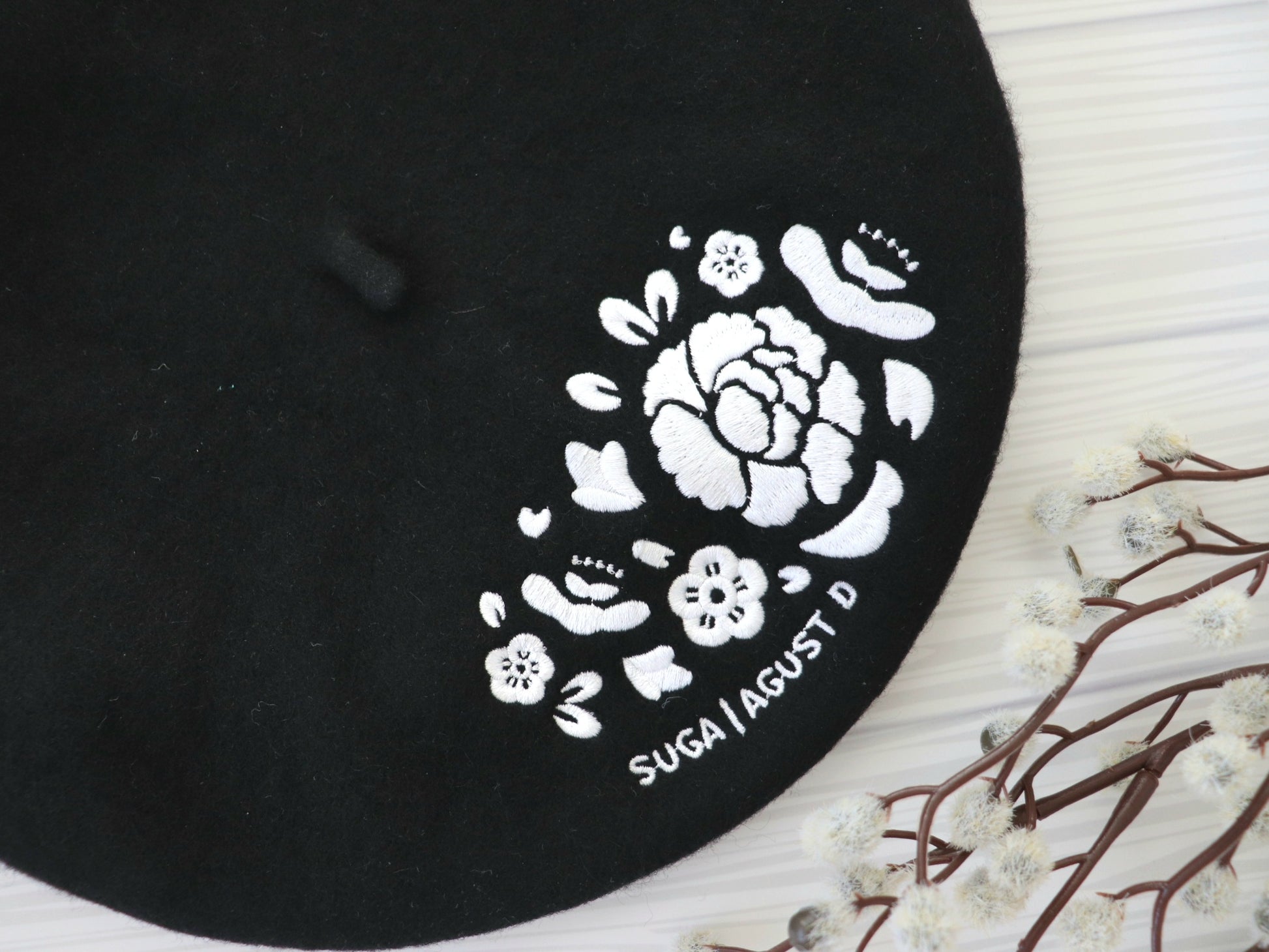 💮 Black beret with floral details embroidered on the front and back. The back additionally features a small "SUGA | AGUST D" text.