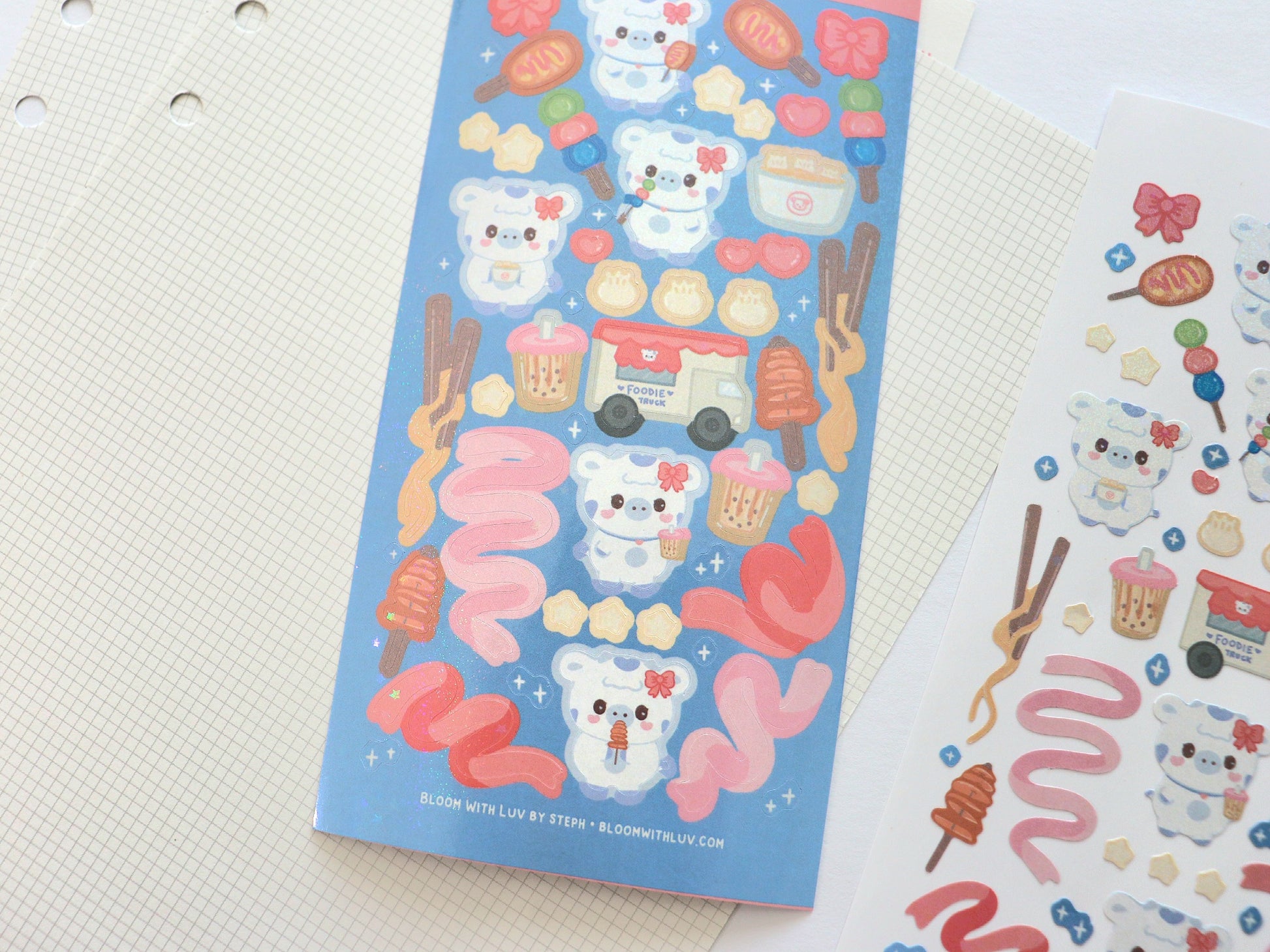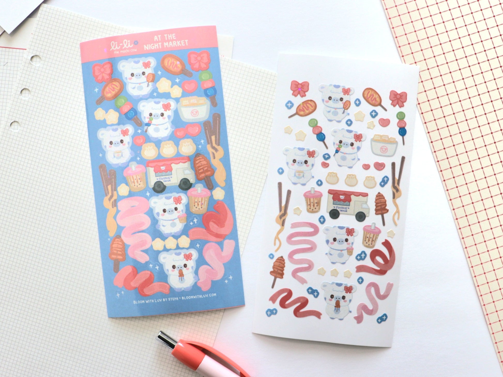 Let's go to the night market with Li-Li the Mochi Cow! Featuring favorite iconic night market snacks like tanghulu, tornado potato stick, corn dog, boba, ramen and dumplings. The perfect deco sticker sheet for foodies.