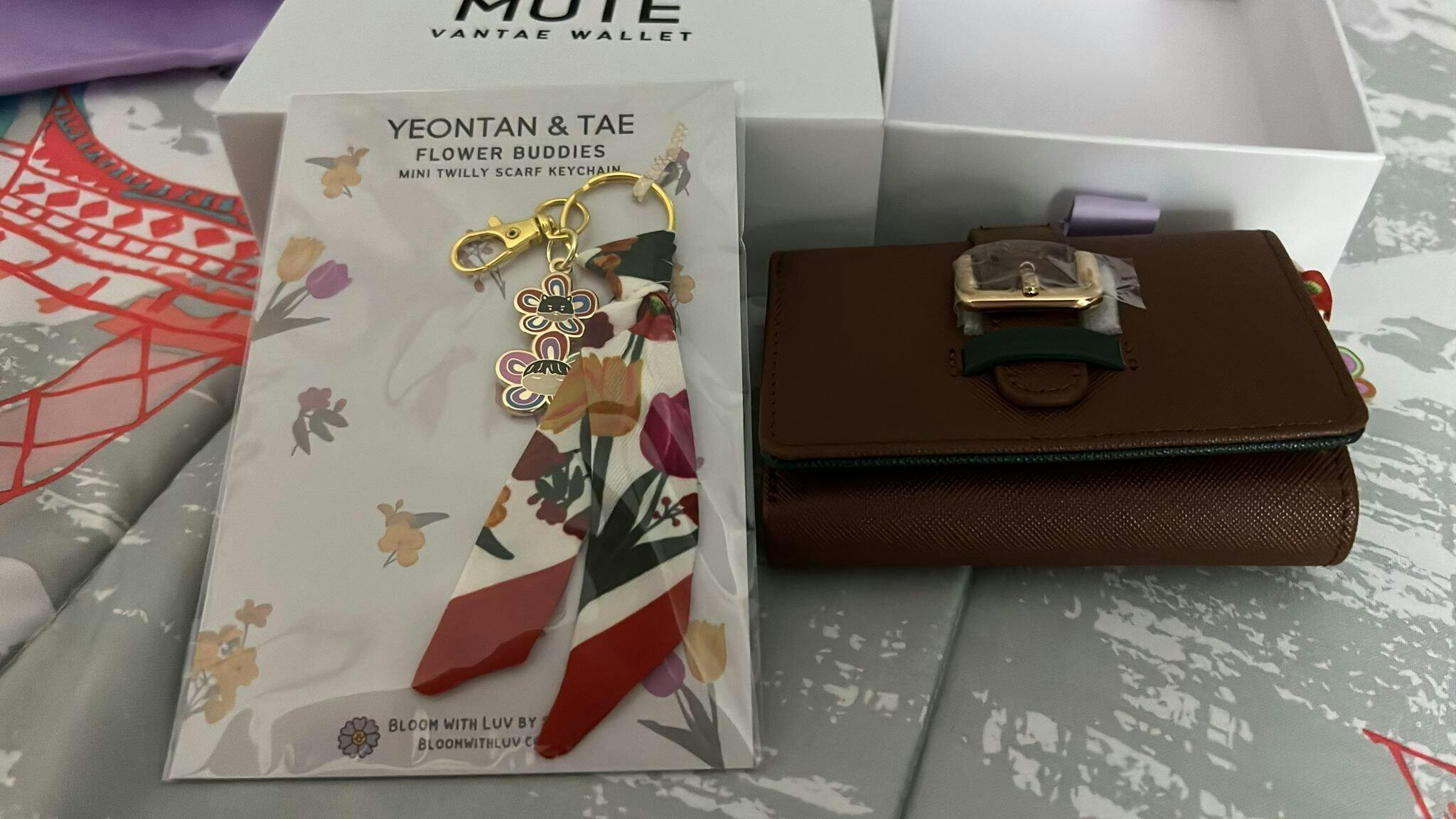 A cute and luxurious keychain inspired by Taehyung's Mute Boston bag twilly scarf and Flower Buddies brooches from the Artist Made Collection.