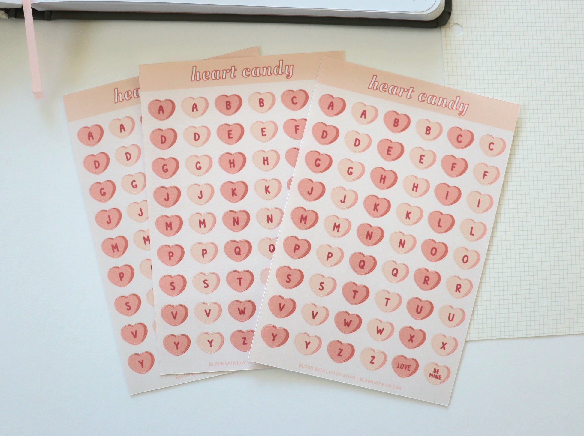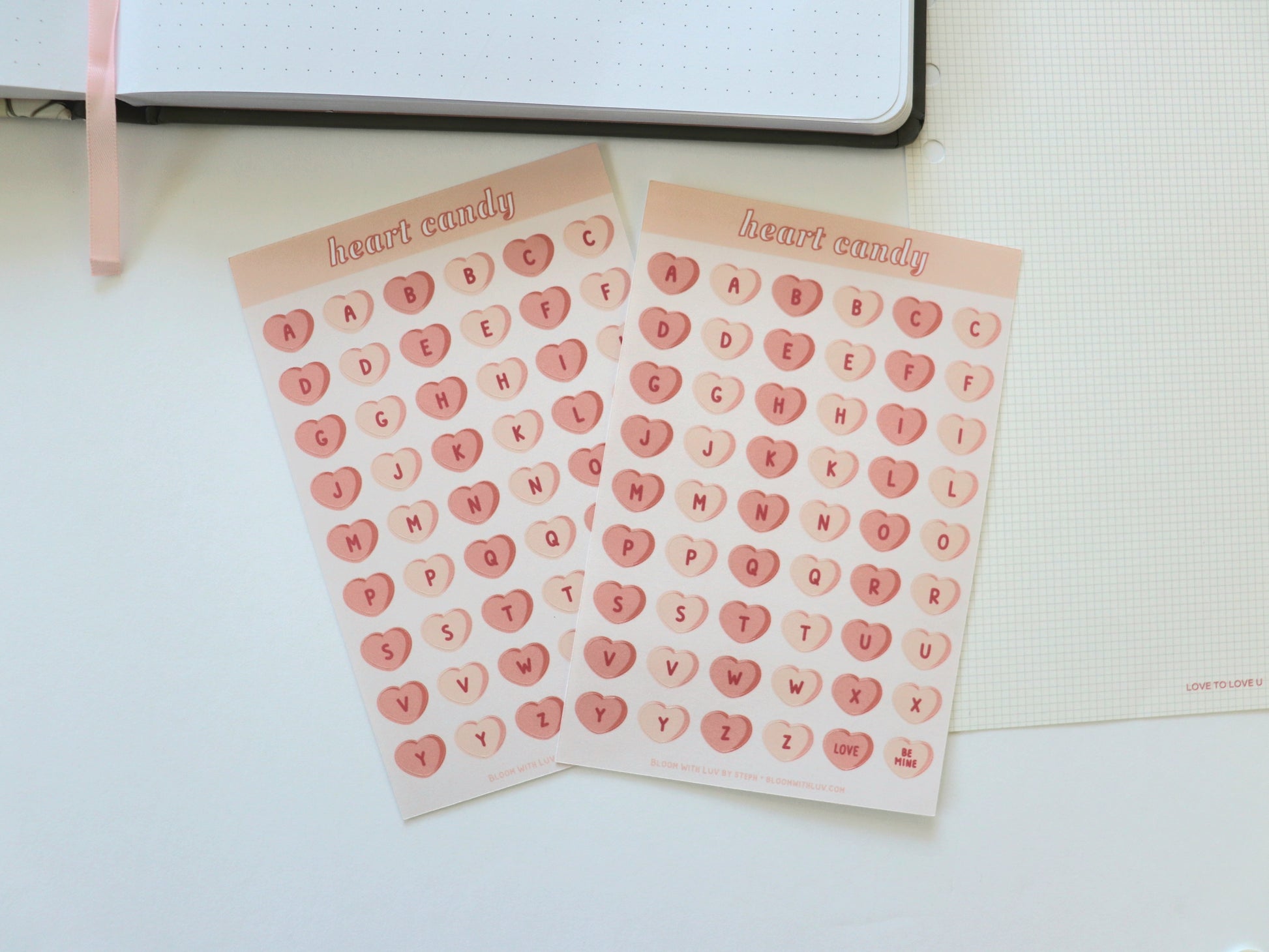 Alphabet sticker sheet with candy hearts in a pink and red color palette. Perfect to decorate your journals, polcos, toploaders, and more.