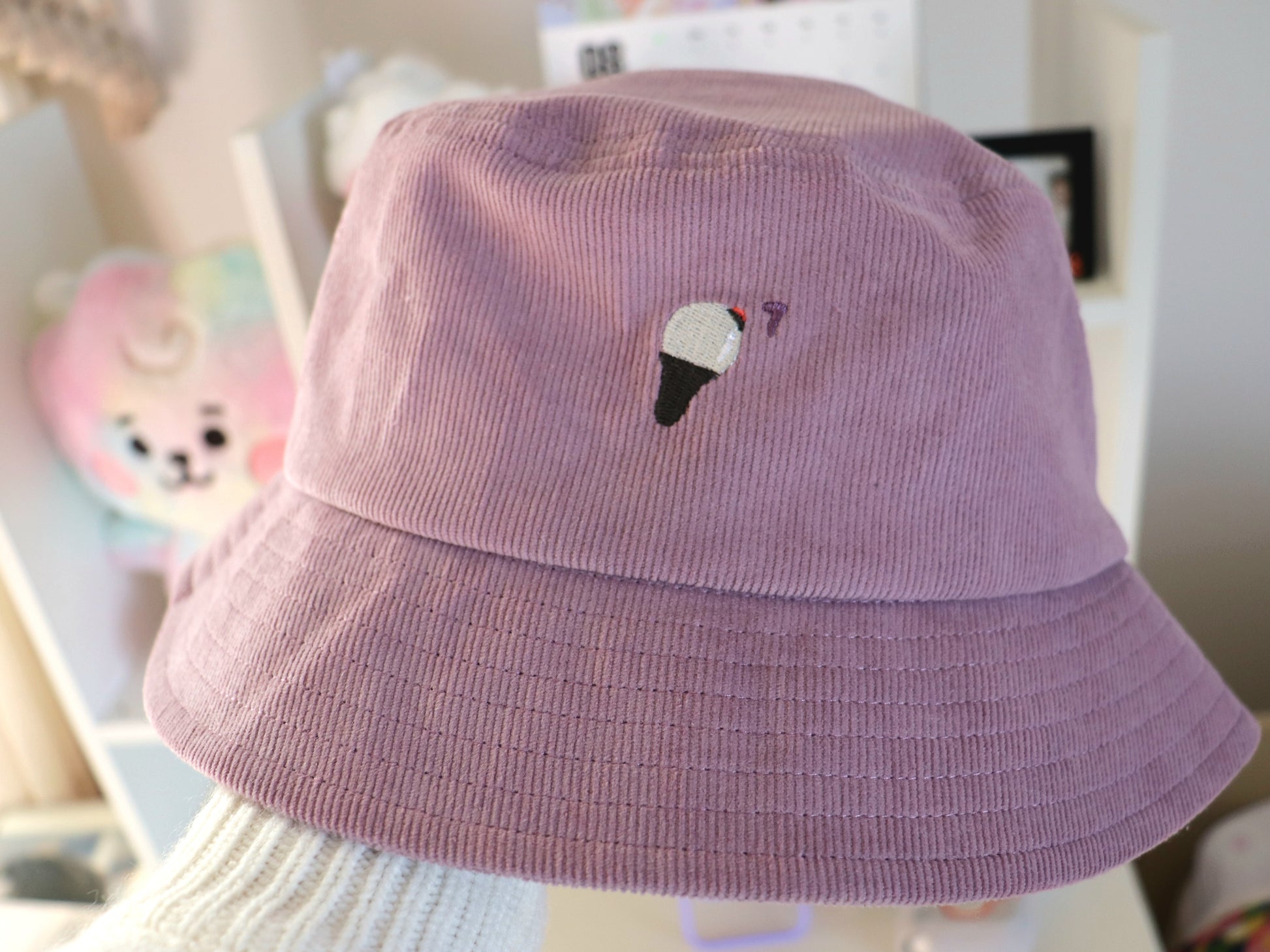 💜 Borahae lilac purple corduroy bucket hat with a mini ARMY bomb and little number 7 embroidered on the front