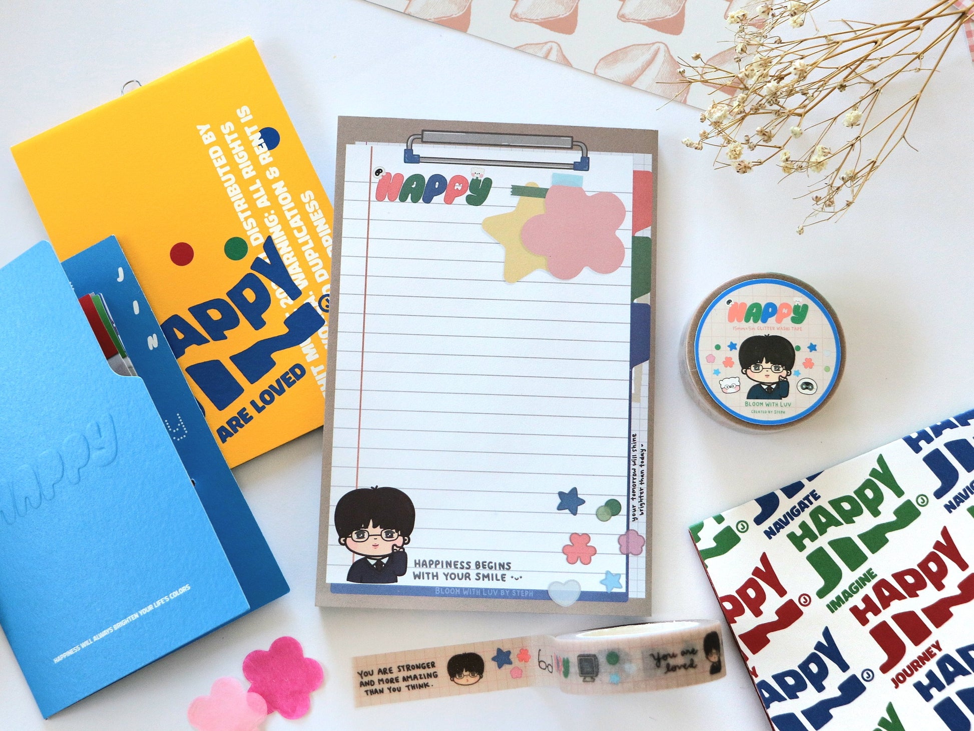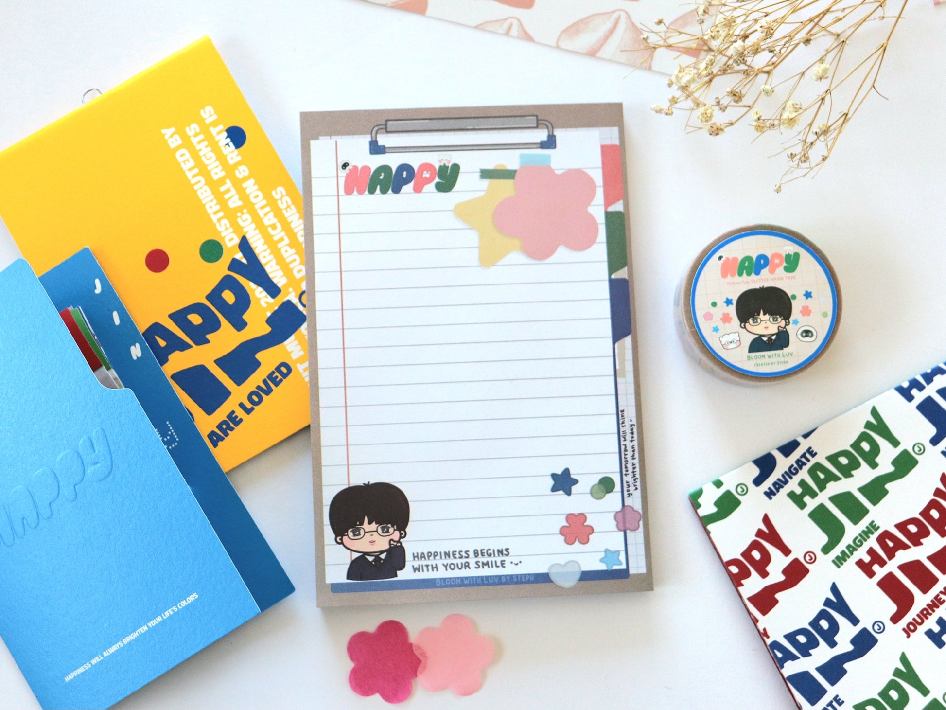 Taking inspiration from Jin's Happy office concept theme, this memo pad is designed to look like a little clipboard where you can write all your important notes! The pages feature some positive messages and reminders from Jin to bring some happiness to your days.