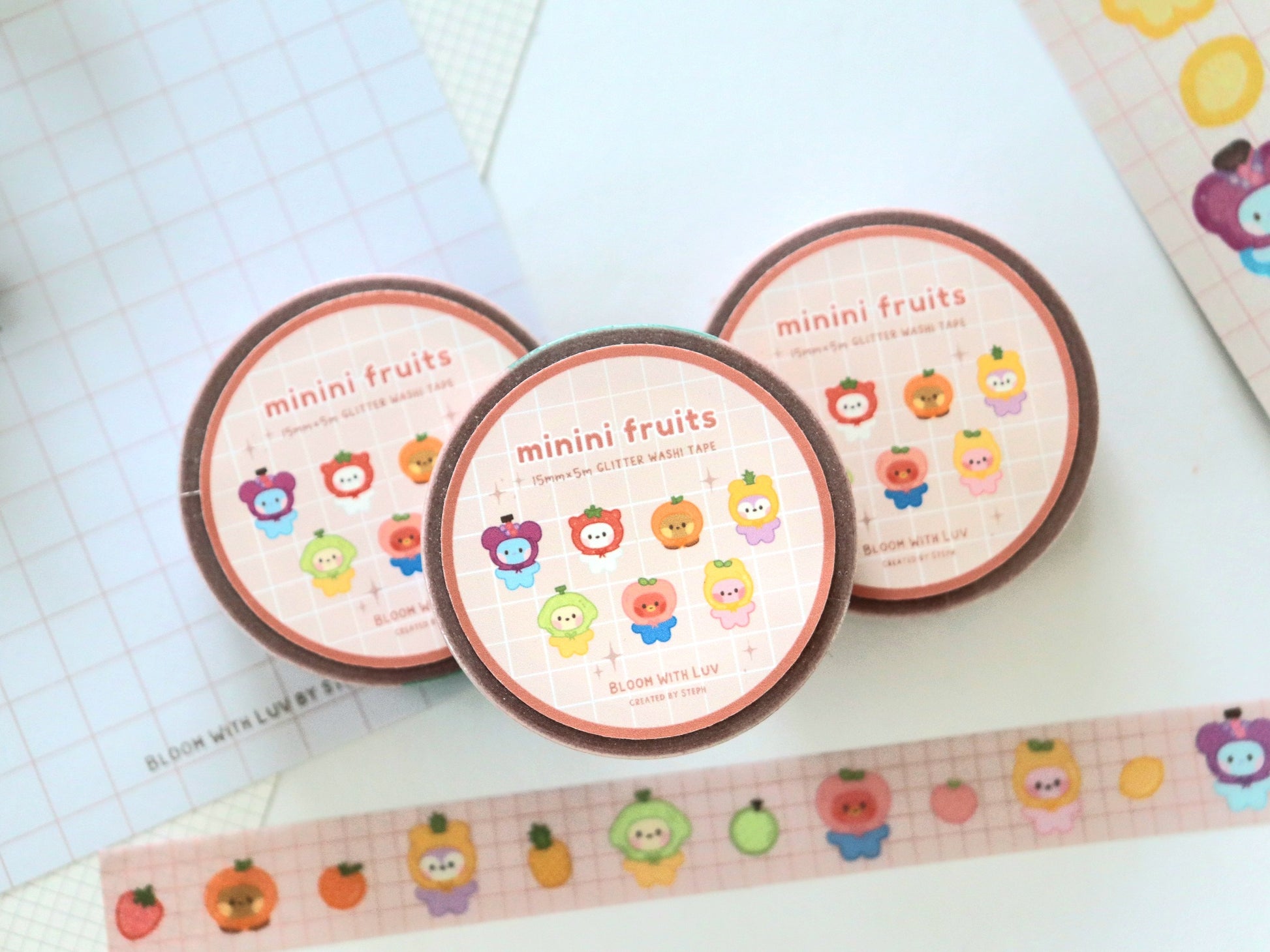 For all the foodies who love cute things and want to brighten their days with some glitter and minini fruits! Grid design decorative washi tape featuring little mininis with fruit hats.