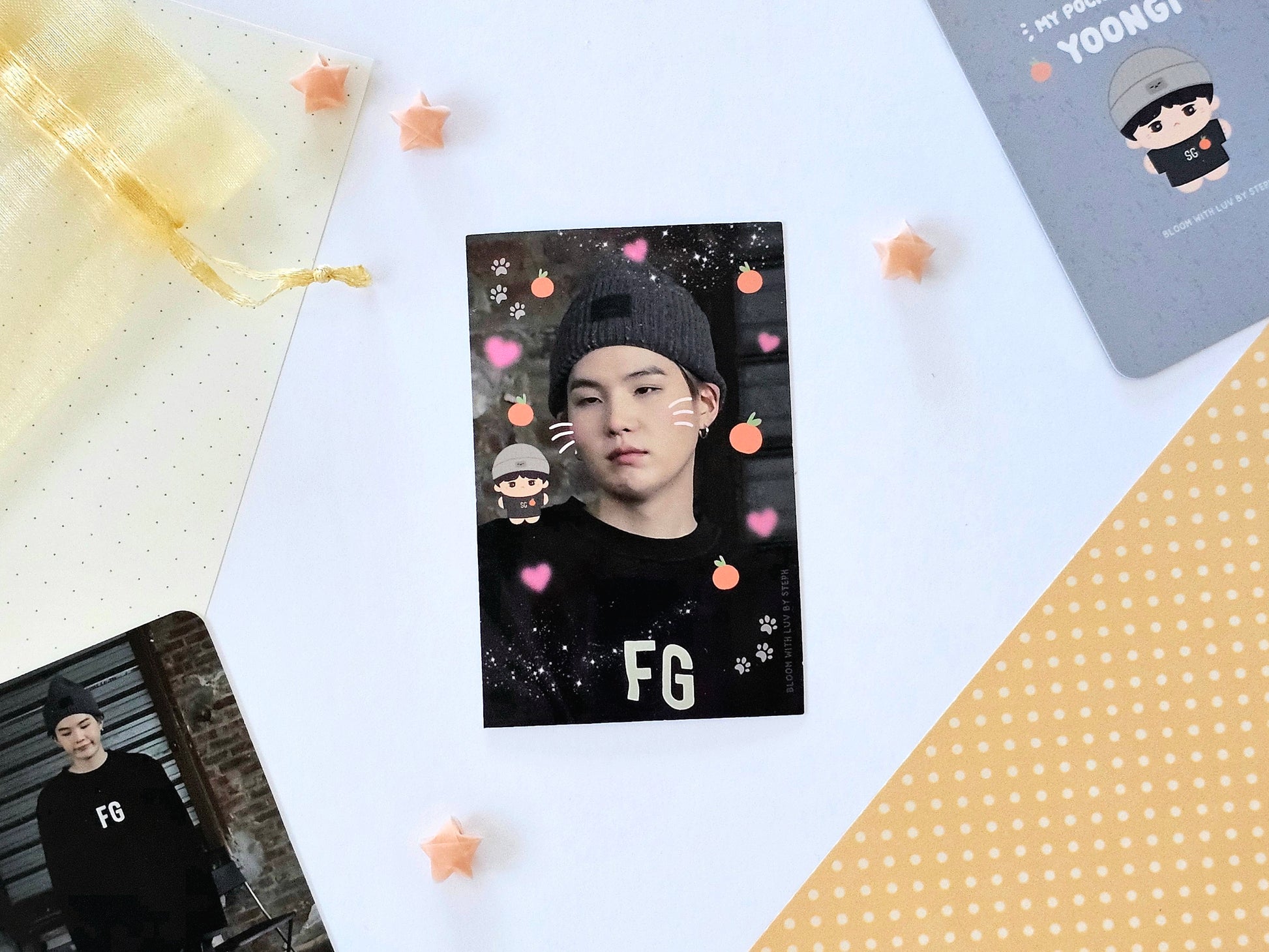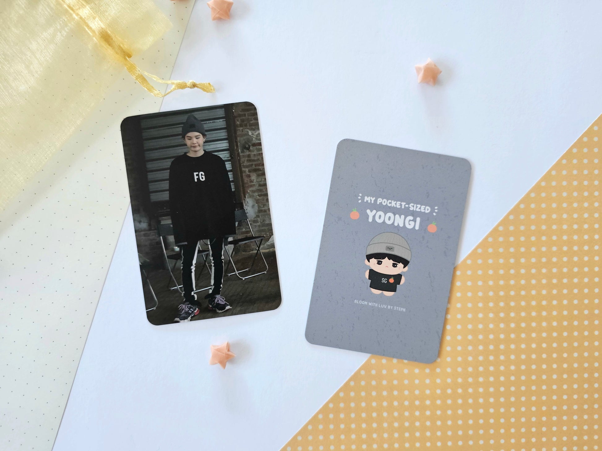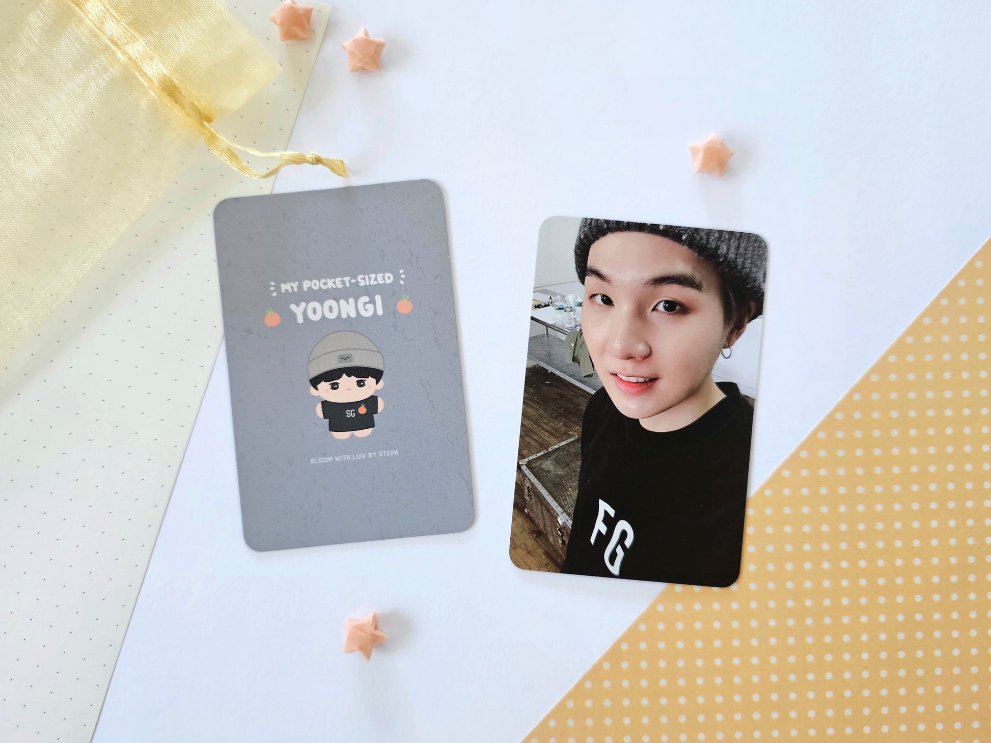 🩶 Glossy photo is one-sided. Matte photocards are double-sided (front: photo of Yoongi, back: illustration of pocket-sized Yoongi)