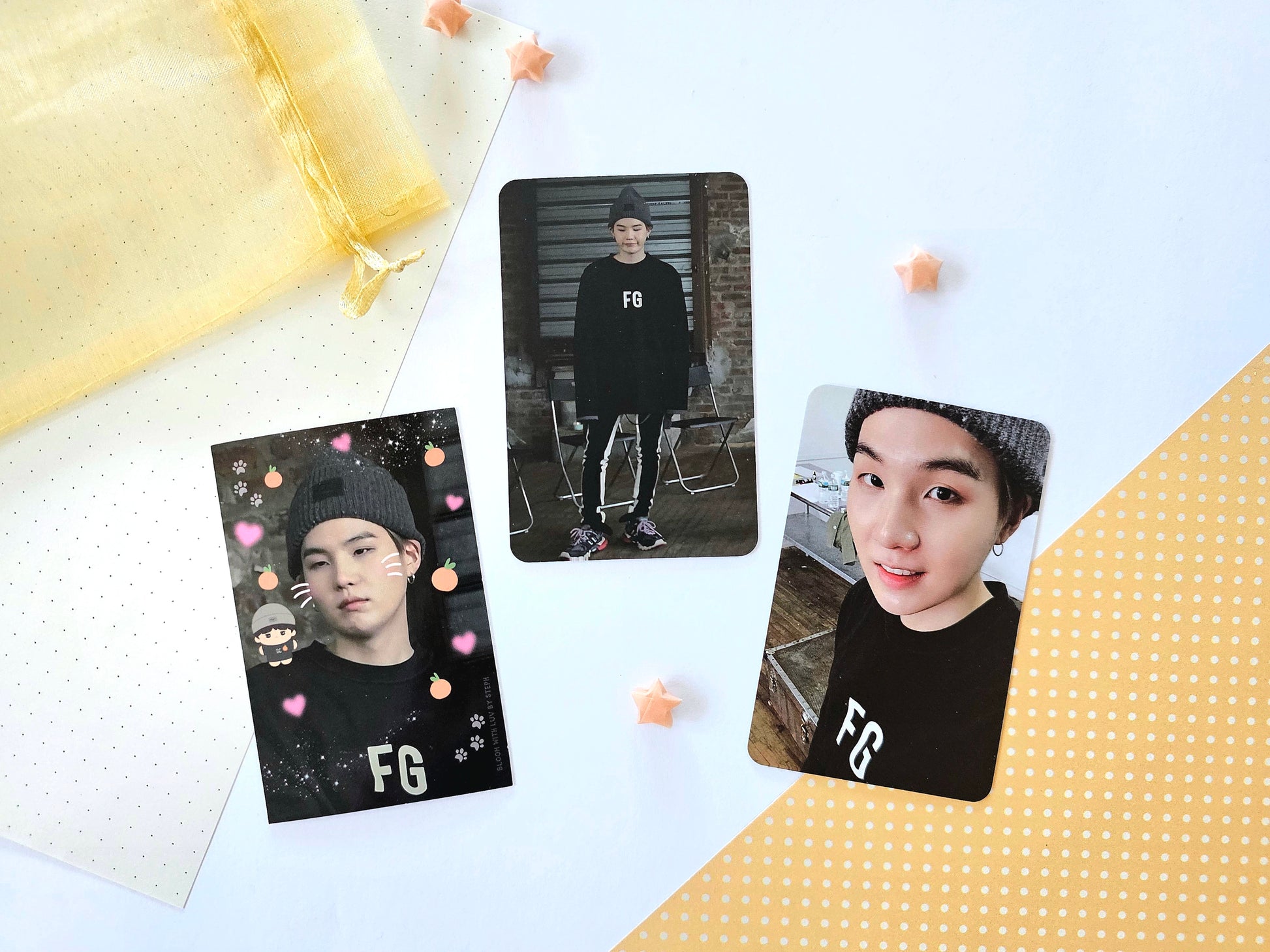 The set includes 1 glossy photo and 2 matte rounded corner photocards of Yoongi (Total: 3 photos).