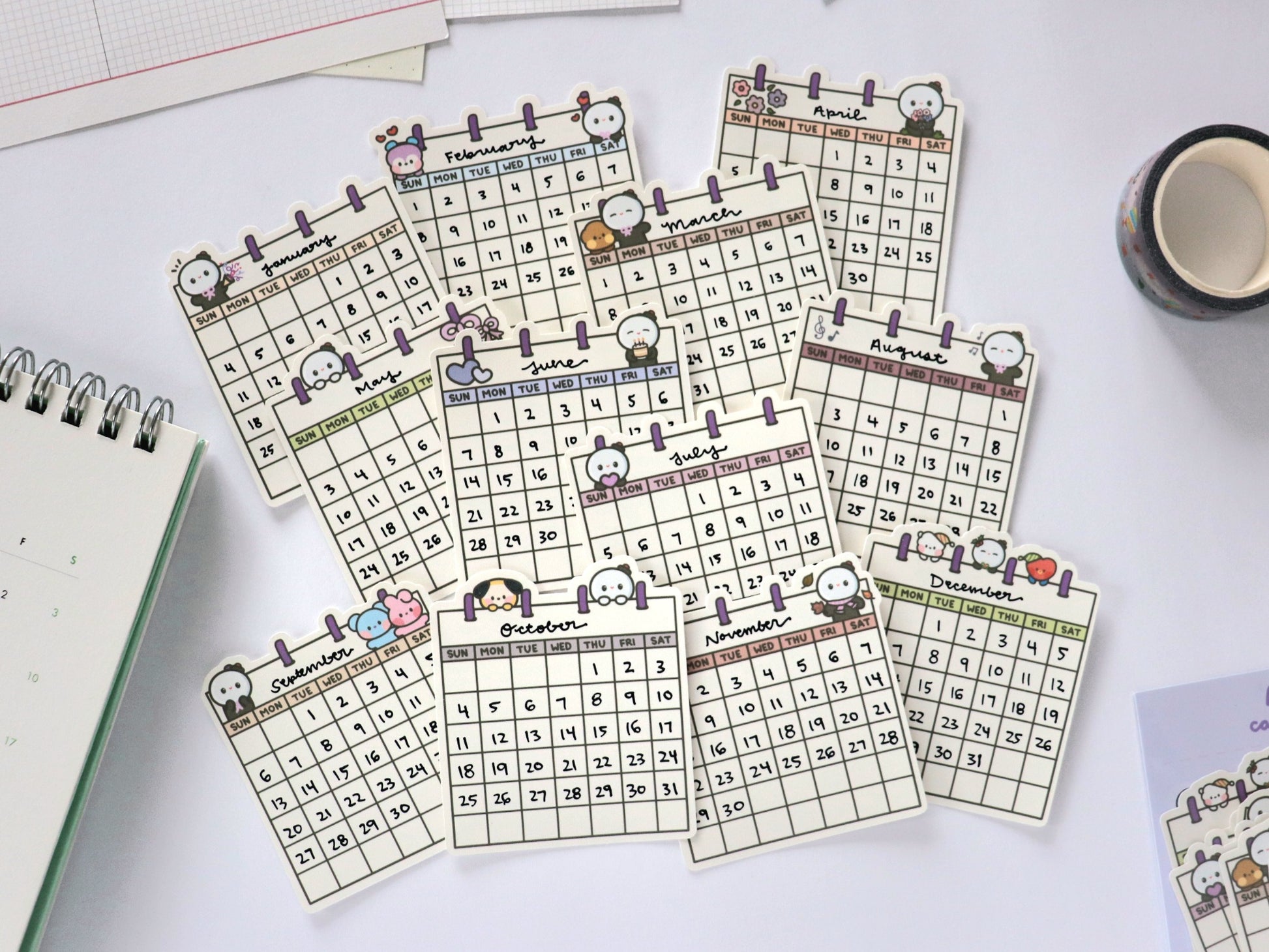 Calendar stickers ft. a little army bomb mascot and Bangtan-related designs. Created to help you decorate and organize your Bangtan-filled year in a fun and cute way in your journals, planners, and more. These are timeless blank calendar stickers, so you can choose from the variety of designs and customize your months by writing in the month and dates yourself!