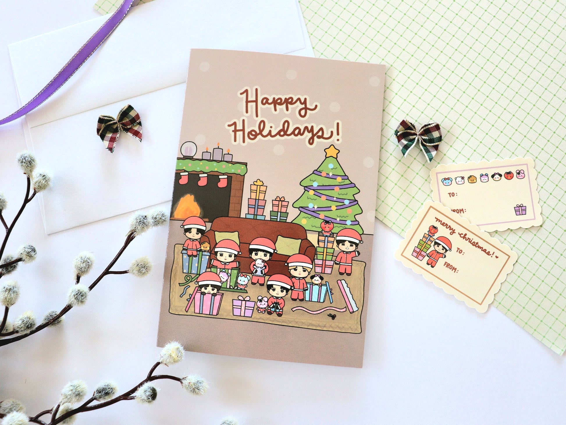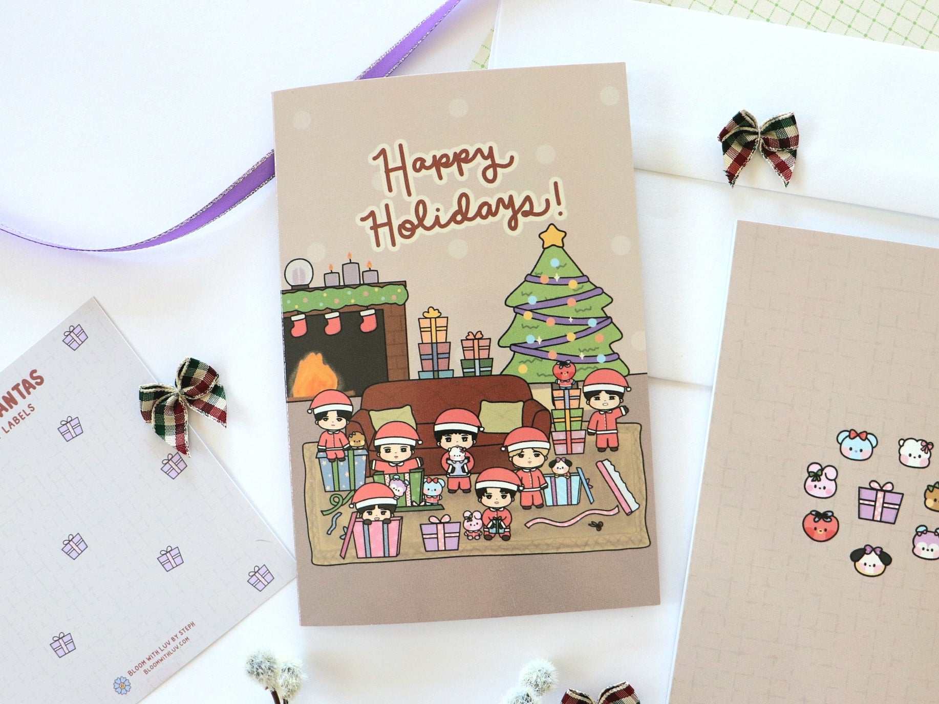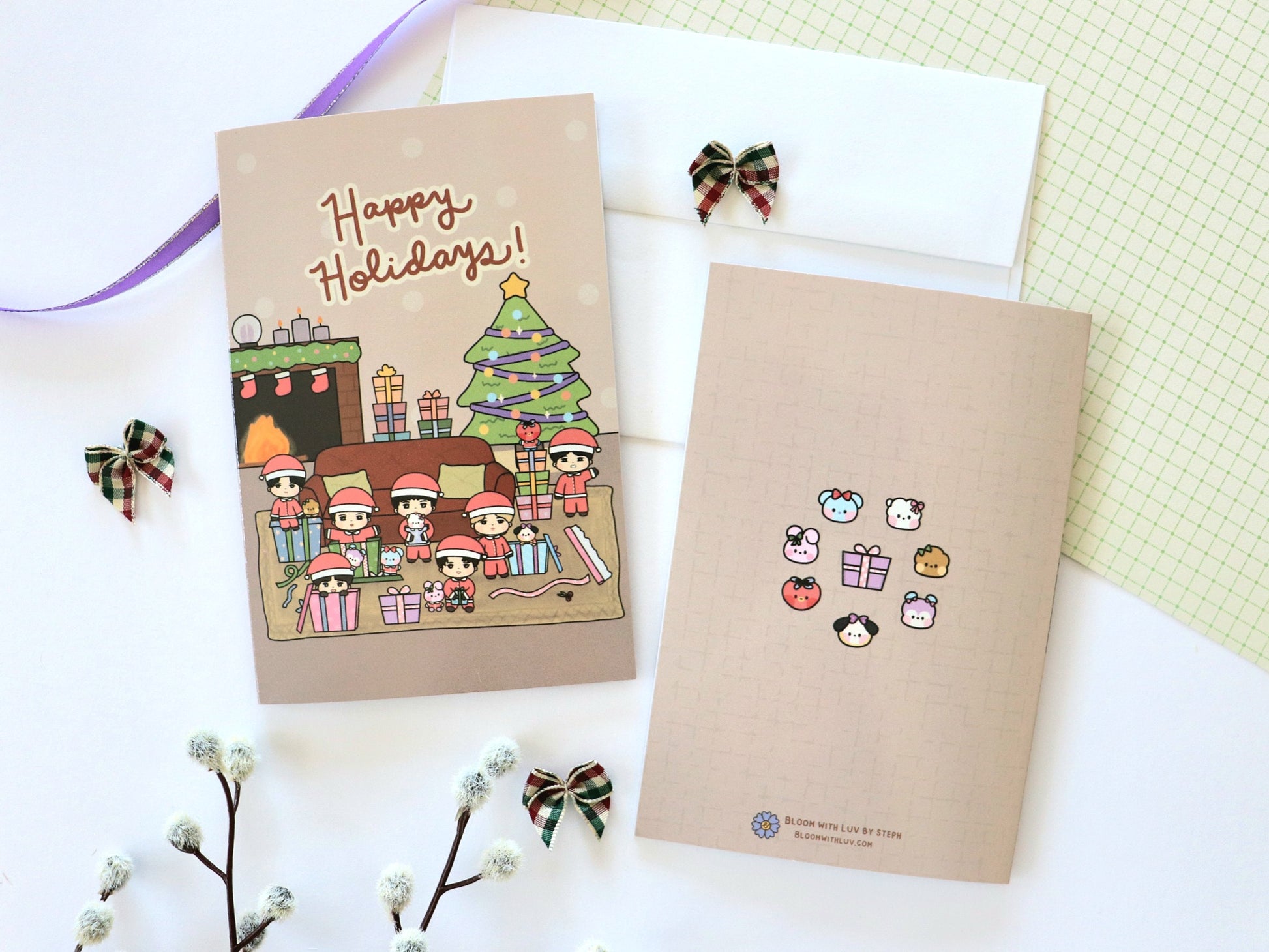 A cozy Bangtan holiday card for ARMY. The front of the card features Bangtan preparing gifts with their minini friends! The back of the card has a simple design with mininis circling around a small present.