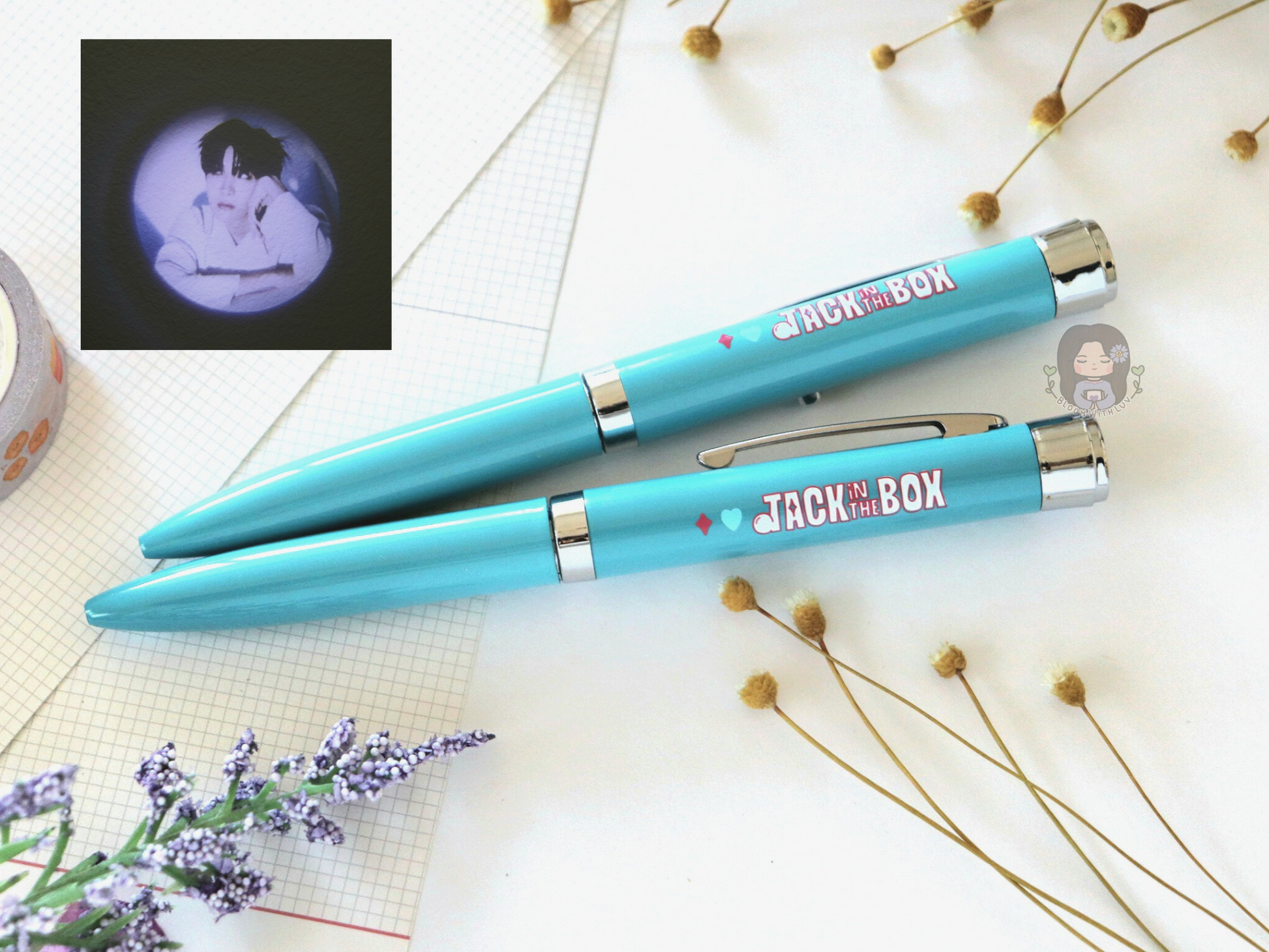 A bundle of 7 special projector pens created to commemorate the beautiful music projects each of the Bangtan members have shared with us. Each pen has been designed to reflect the aesthetics for each of their albums and projects a photo of the respective member from their album concept photos.