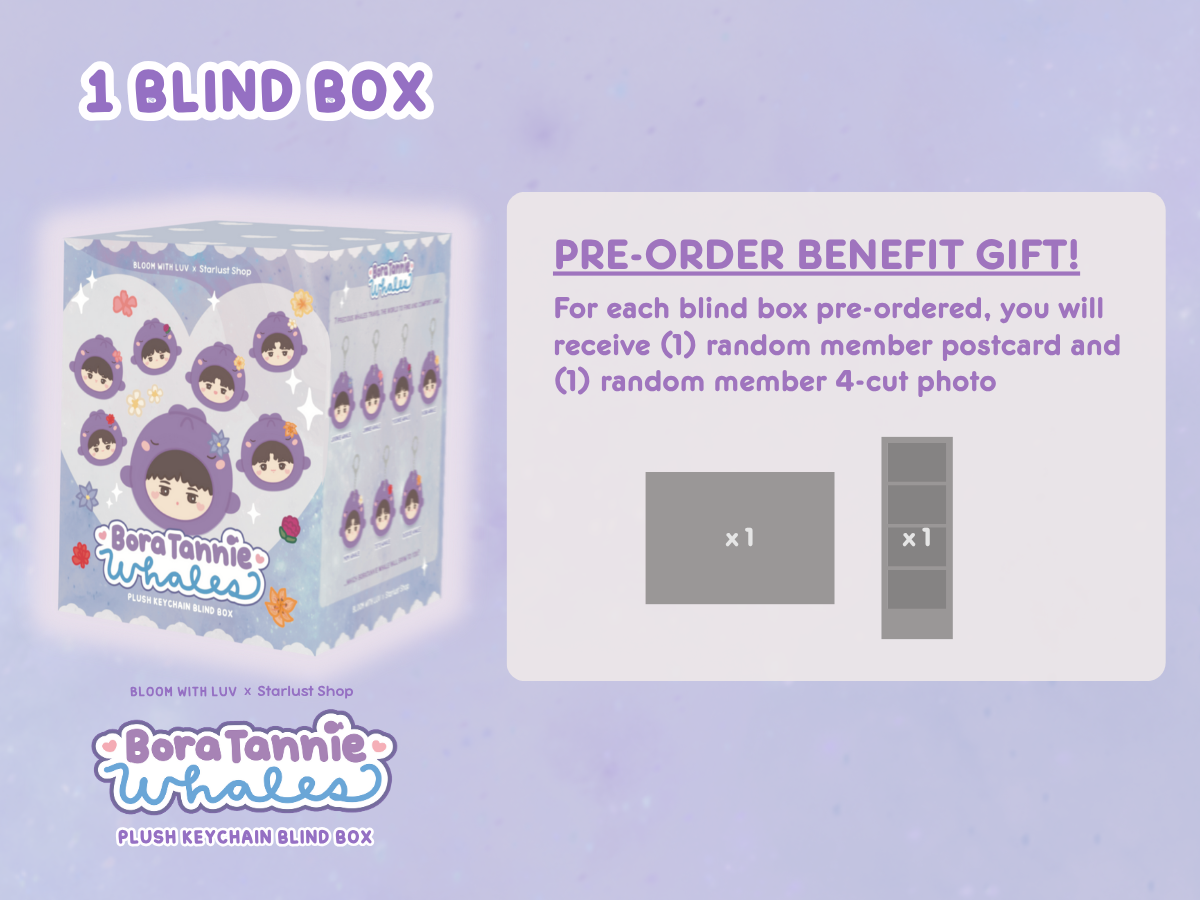 💜 Each blind box comes with 1 random whale plush keychain, 1 matching member photocard, and 1 matching member BoraTannie whale sticker