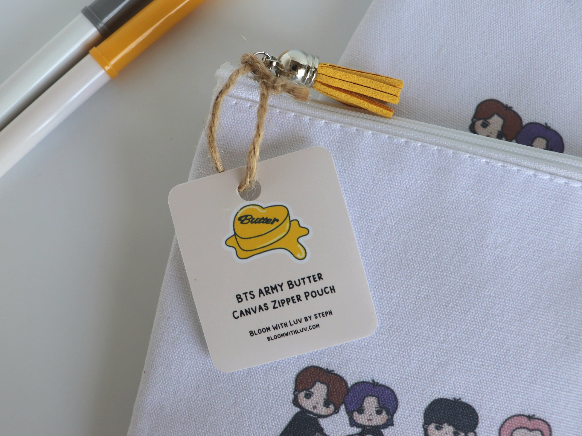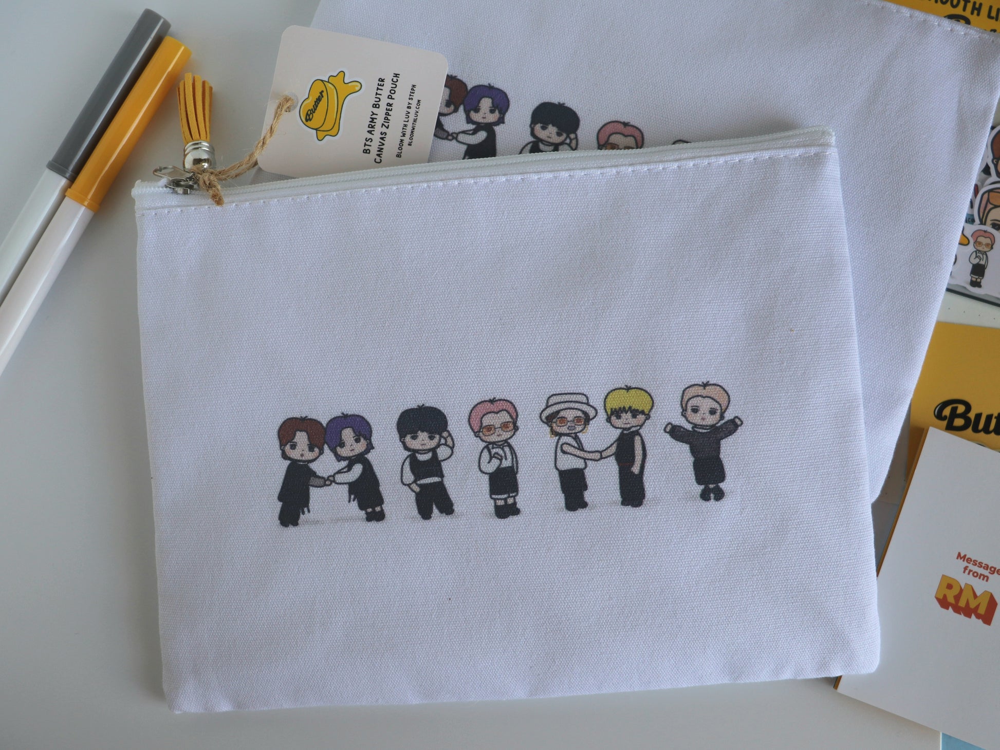 BTS ARMY Butter Canvas Zipper Pouch features the iconic pose from the choreography that sweetly shows the tannies' unconditional love for ARMY.