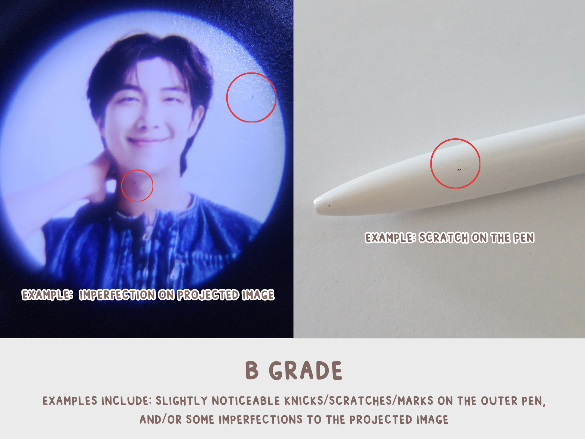 • B Grade: slightly/some noticeable imperfections on the outer pen and/or projection (see photo for examples)