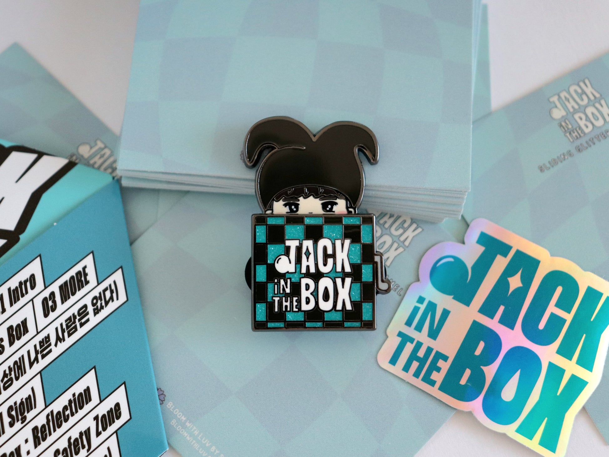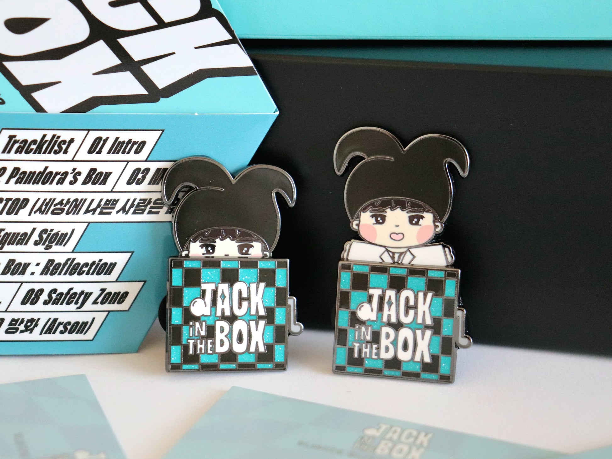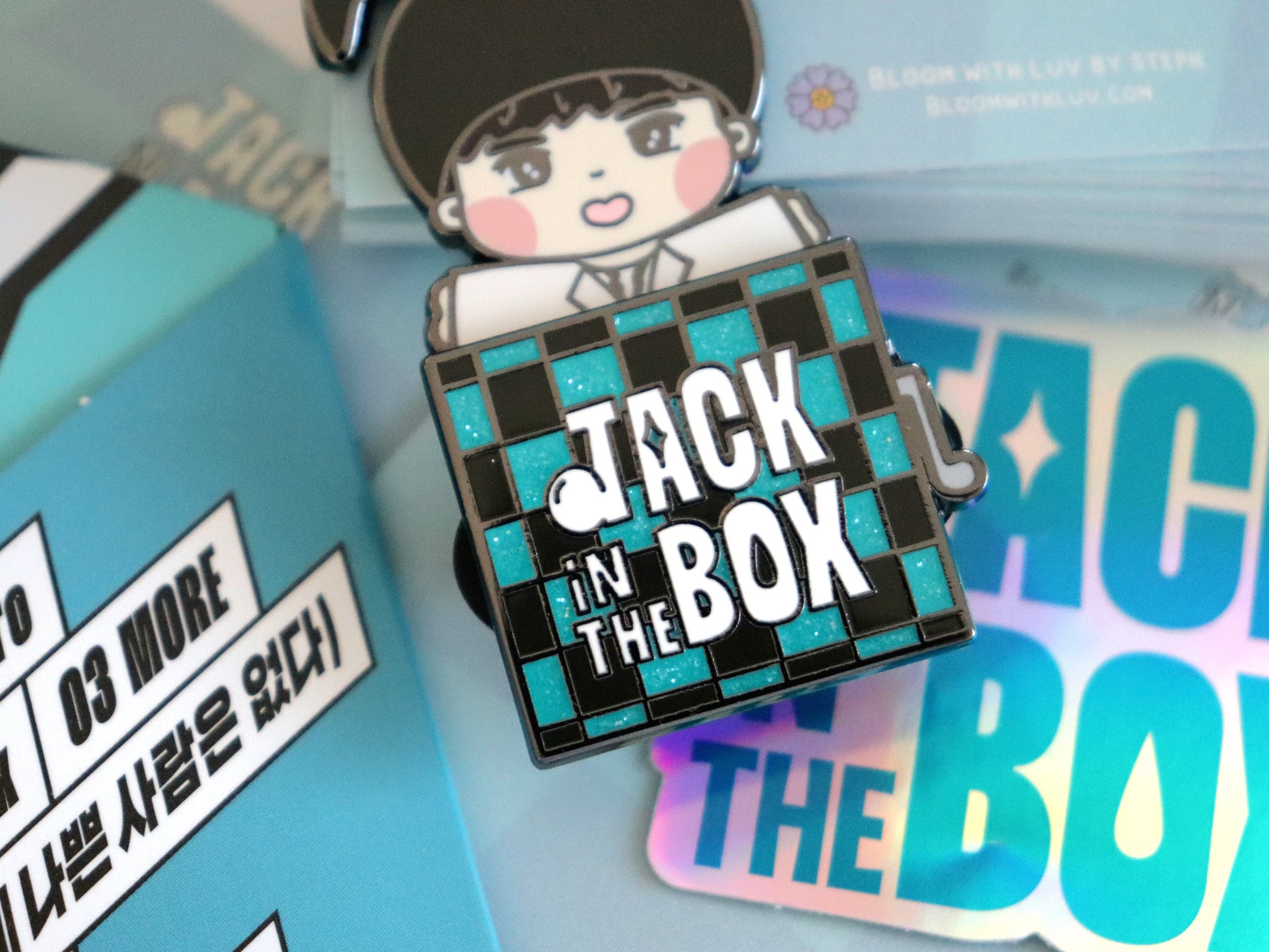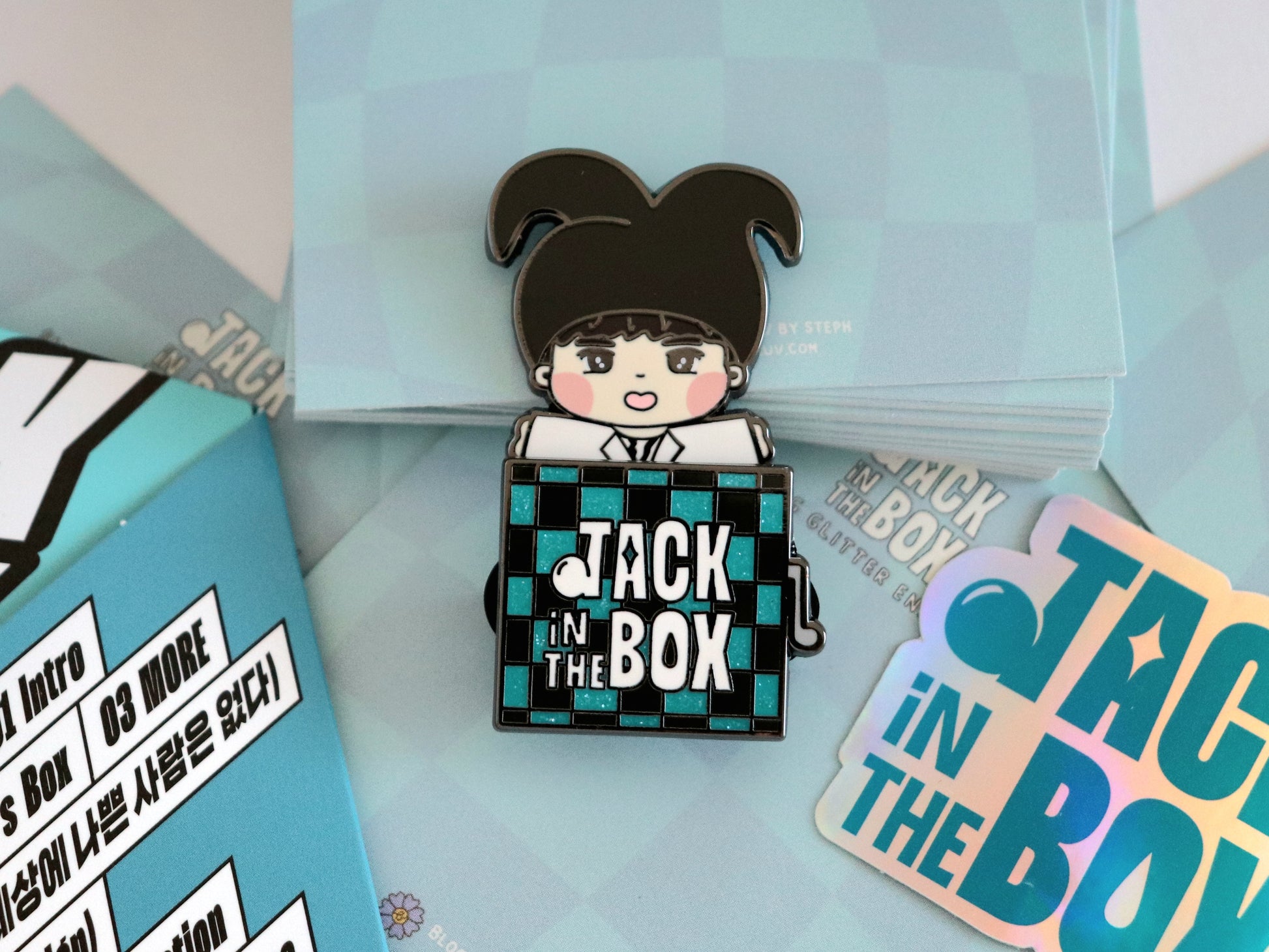 A unique pin created with inspiration from J-Hope's first solo album! Little Hobi peaks behind the box 🤭 but then surprises you like a Jack in the Box. This pin features a cool sliding mechanism and pretty glitter!