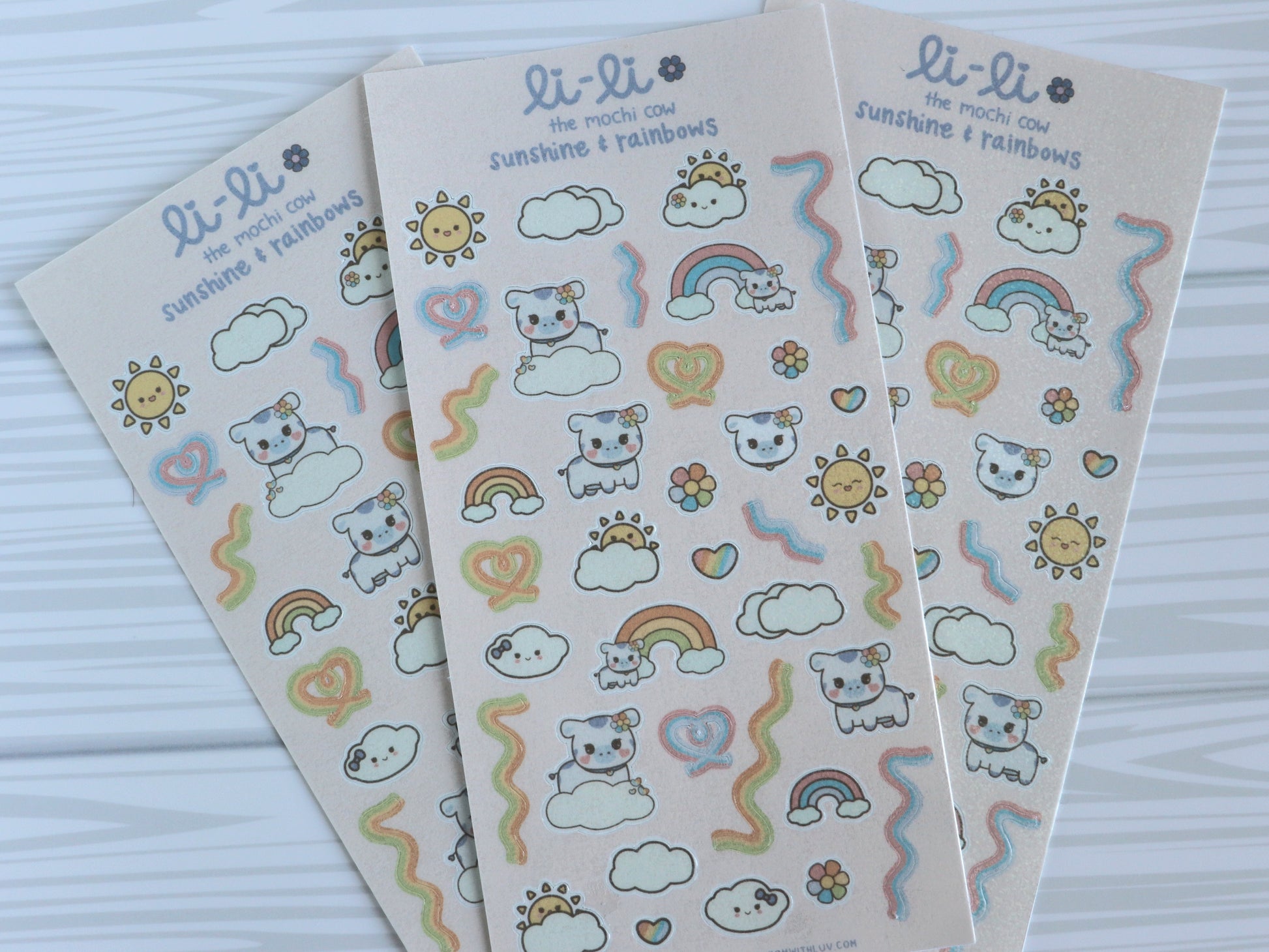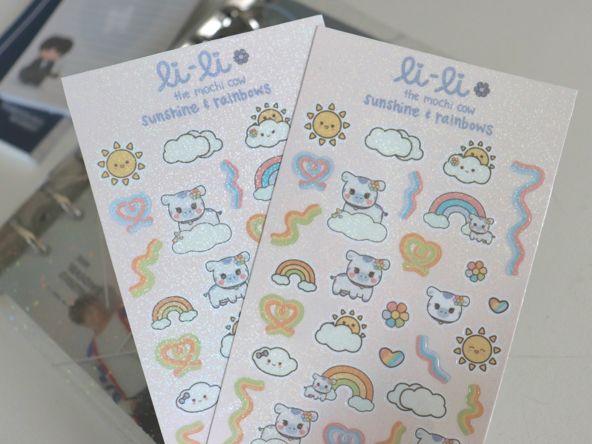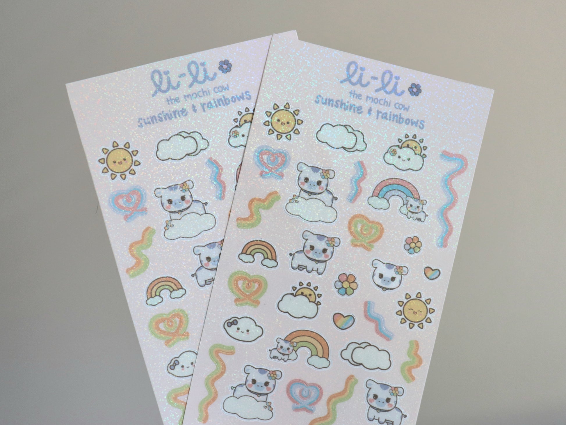 Li-Li the Mochi Cow sticker sheet with mini pastel sunshines, clouds, and rainbows. It has a pixie dust glitter holo overlay to add some sparkle to your deco! Perfect stickers to decorate planners, journals, top loaders and more!