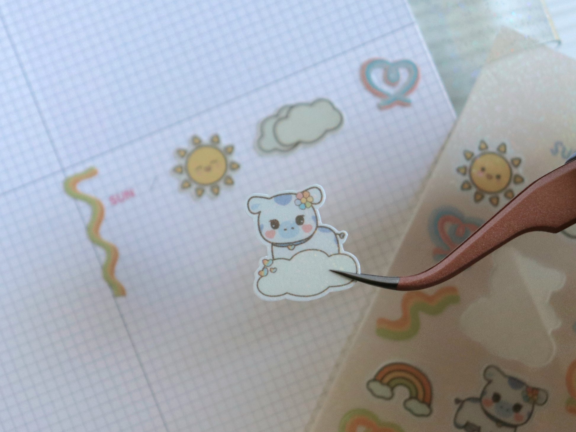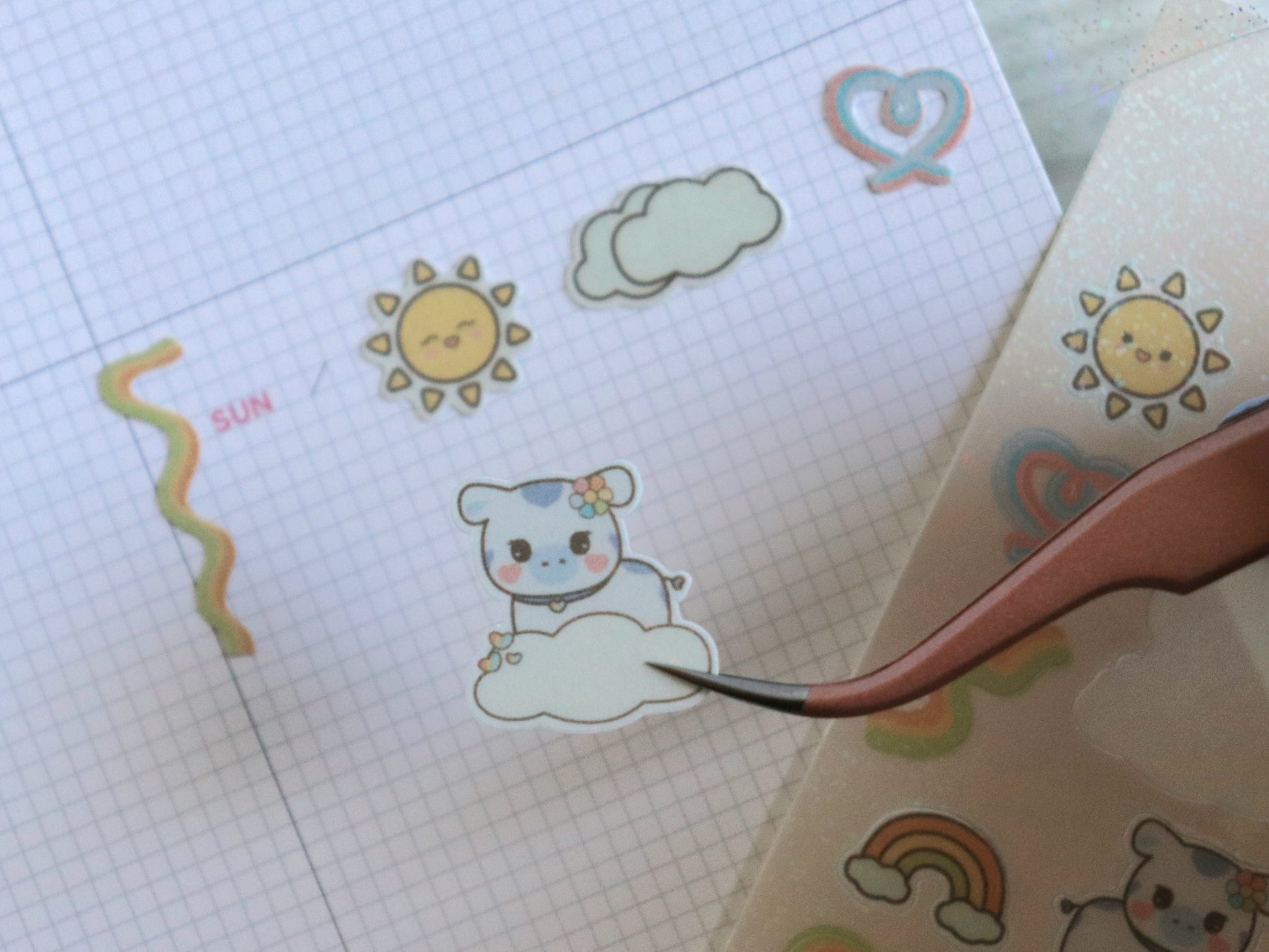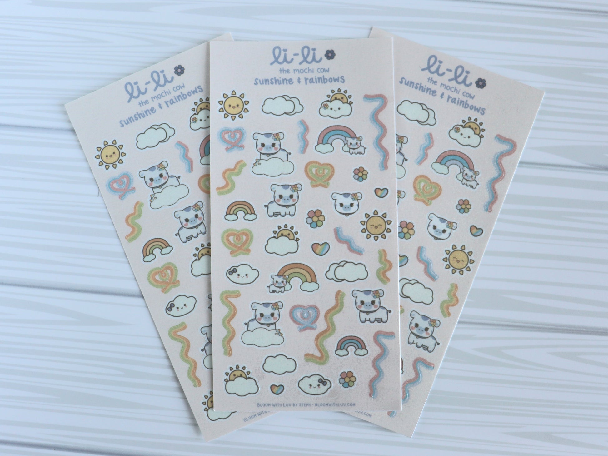 Li-Li the Mochi Cow sticker sheet with mini pastel sunshines, clouds, and rainbows. It has a pixie dust glitter holo overlay to add some sparkle to your deco! Perfect stickers to decorate planners, journals, top loaders and more!