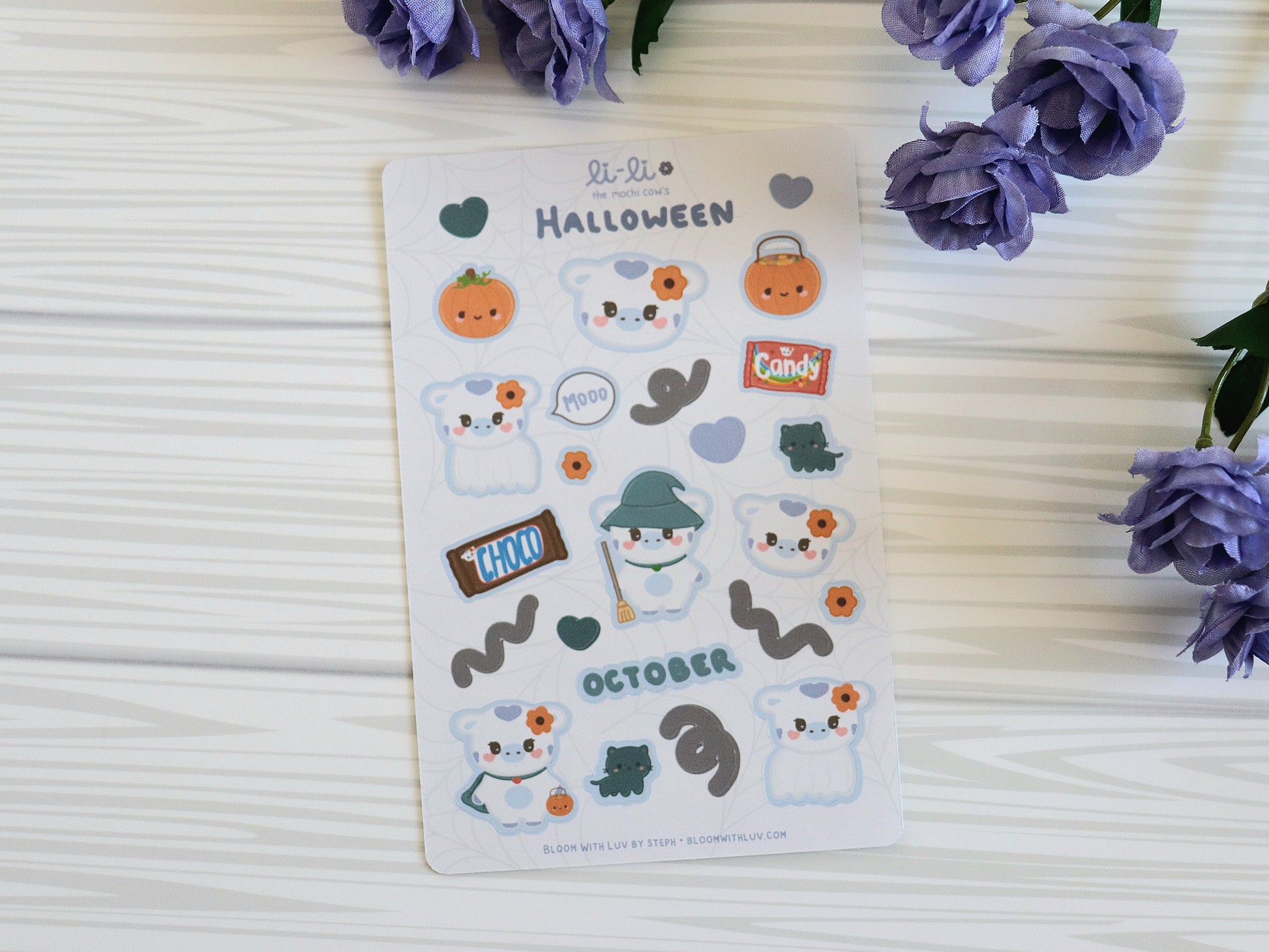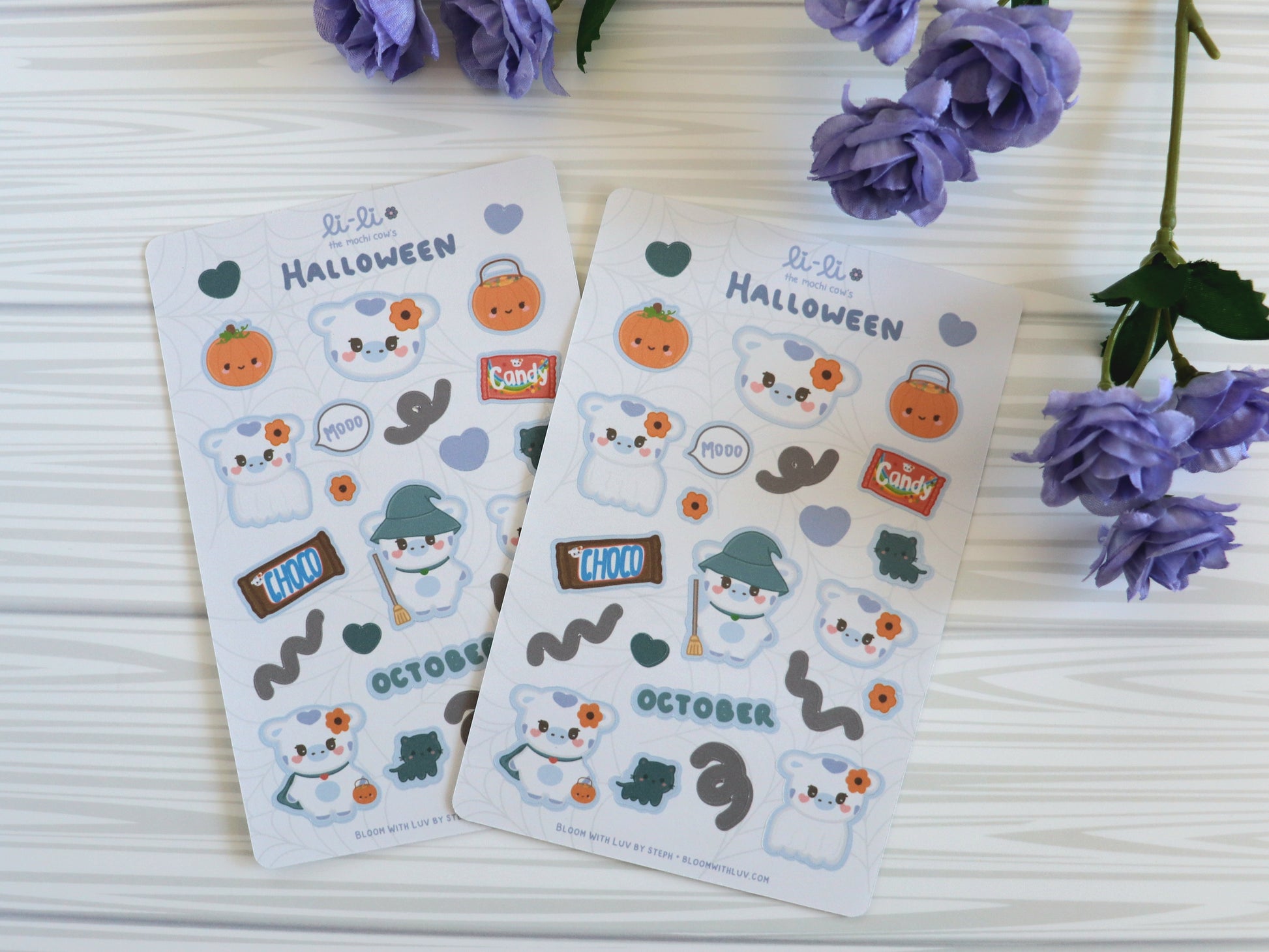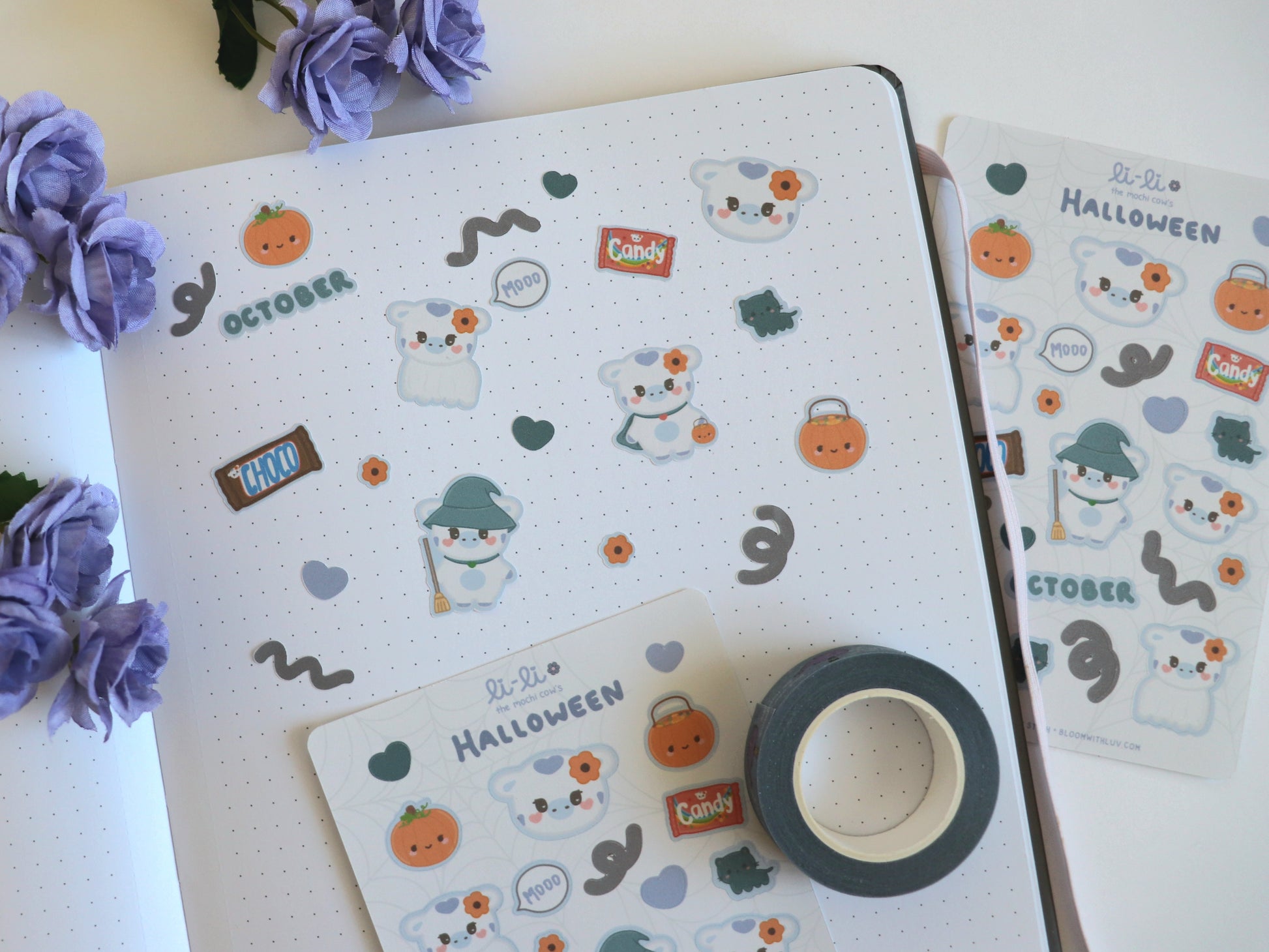 It's Li-Li the Mochi Cow's first Halloween! This sticker sheet features Li-Li in her costumes, ready for trick-or-treating with her small kitty friend, Chip, who is small like a chocolate chip. Add some cuteness to spooky season with these stickers, which are perfect to decorate planners, journals, and more!