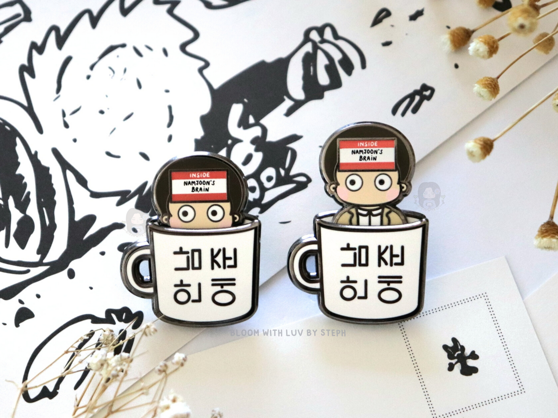Inspired by Namjoon's little character and mug as seen in the LOST! music video. This interactive sliding pin is the perfect companion you can take everywhere with you!