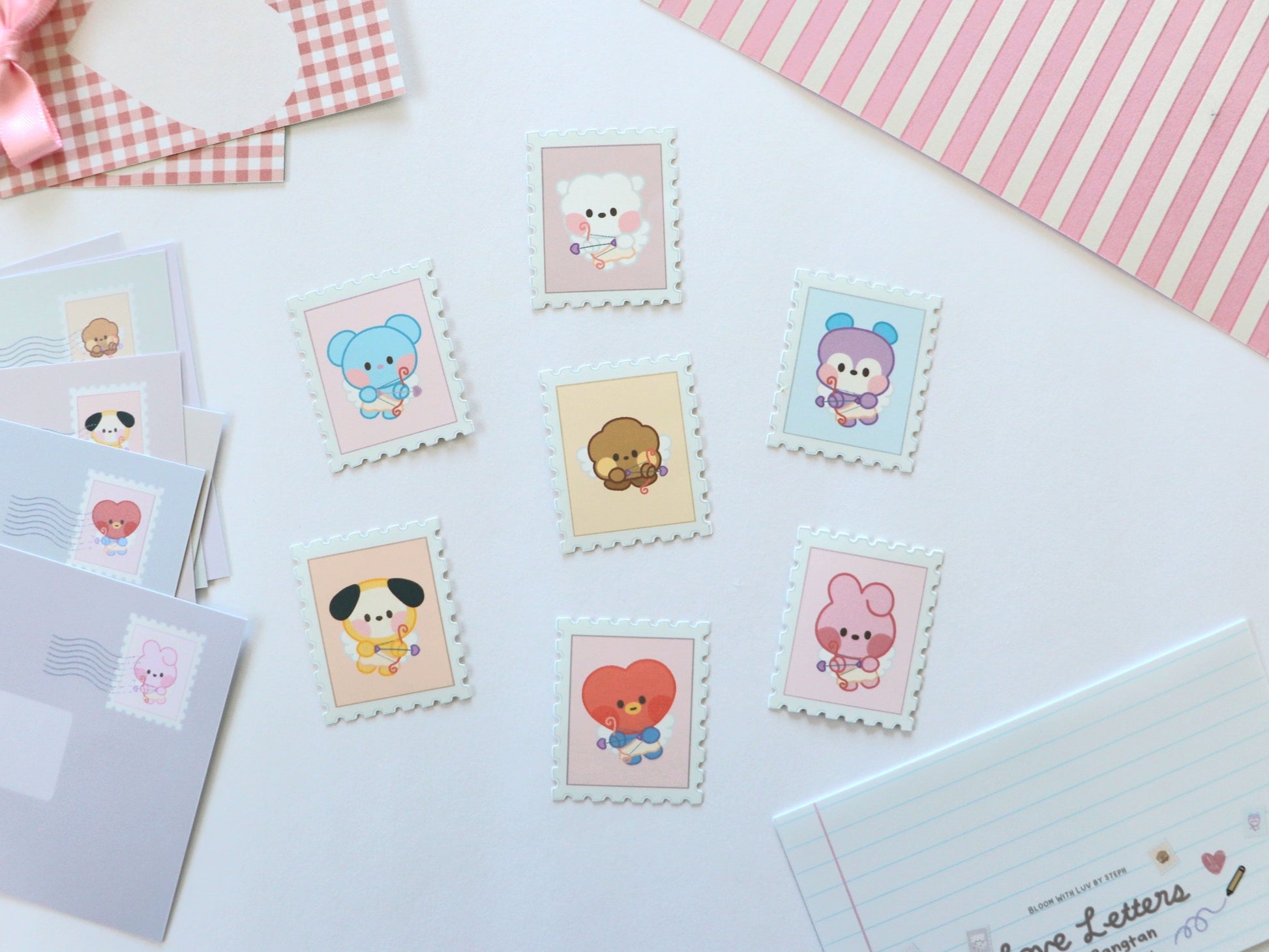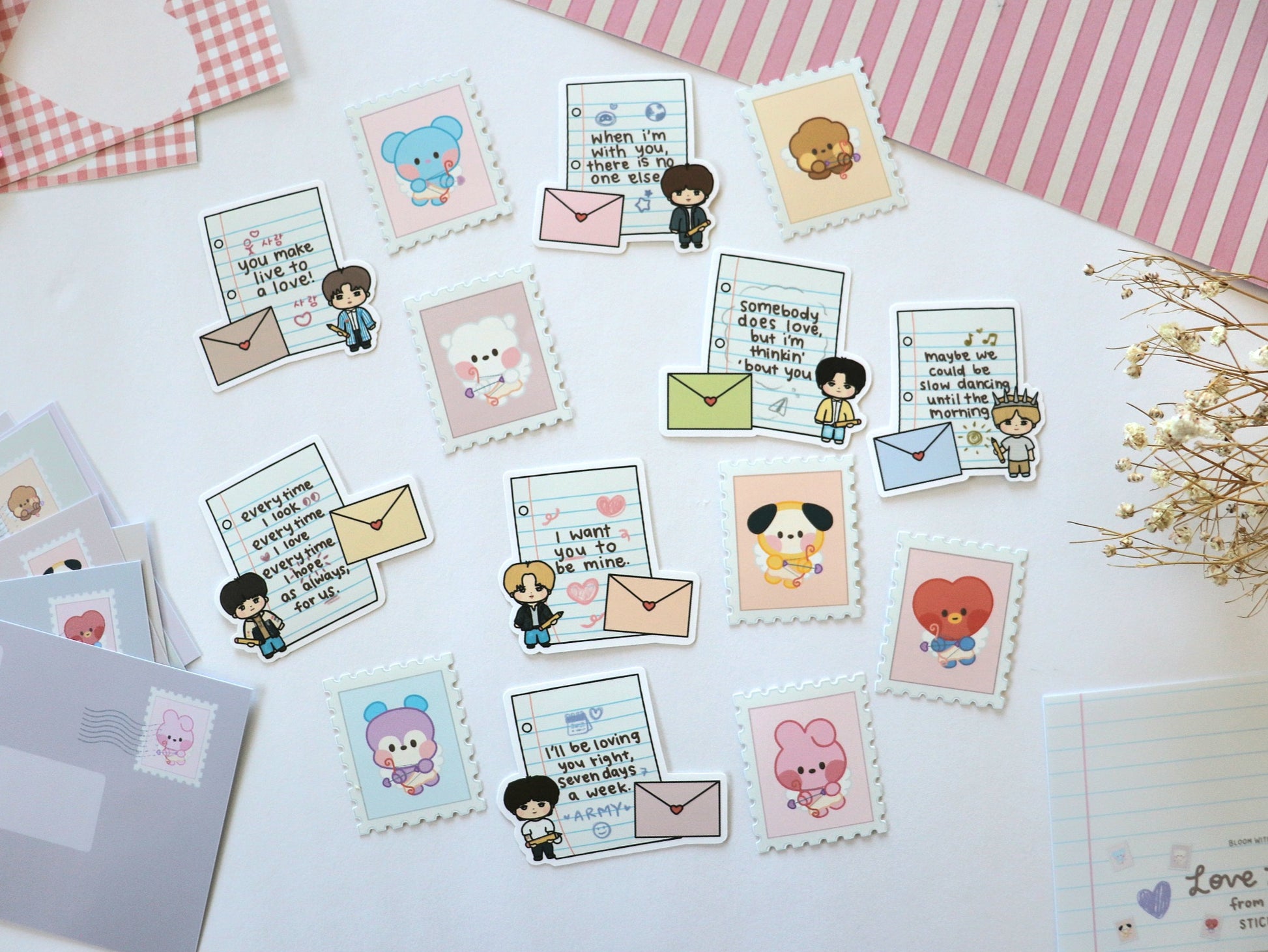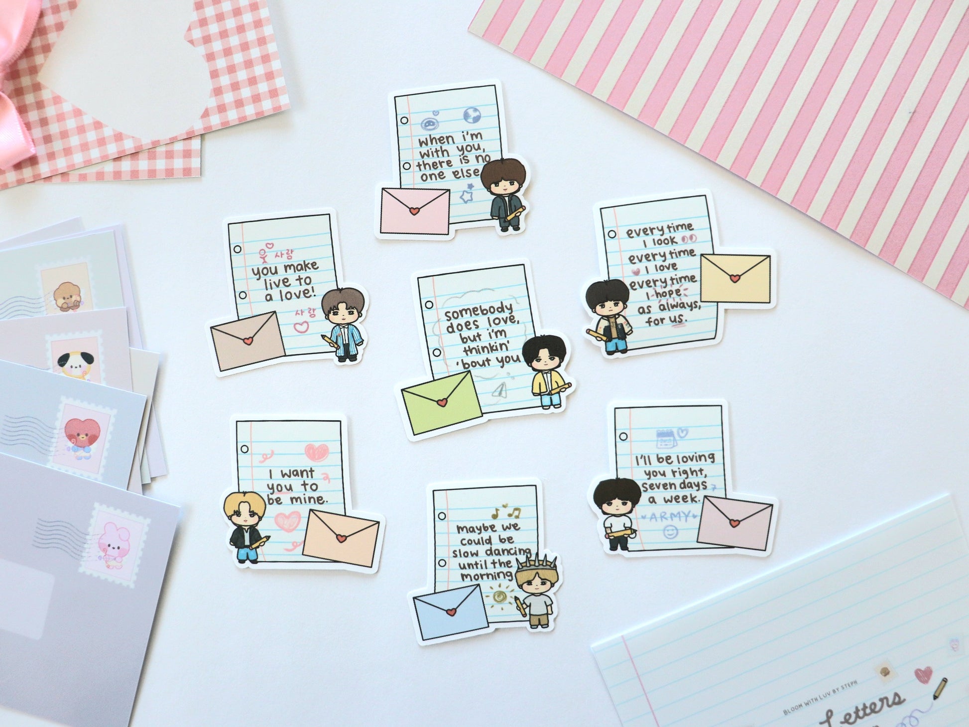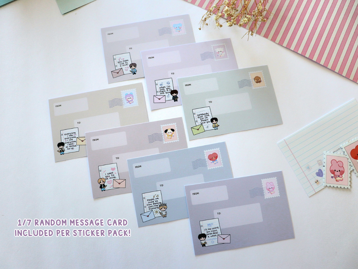 7 not-so-secret admirers have prepared little letters for you! These set of stickers feature lyrics from each member expressing their love as well as 7 more stickers in the shape of stamps with mininis dressed as cupid 💘