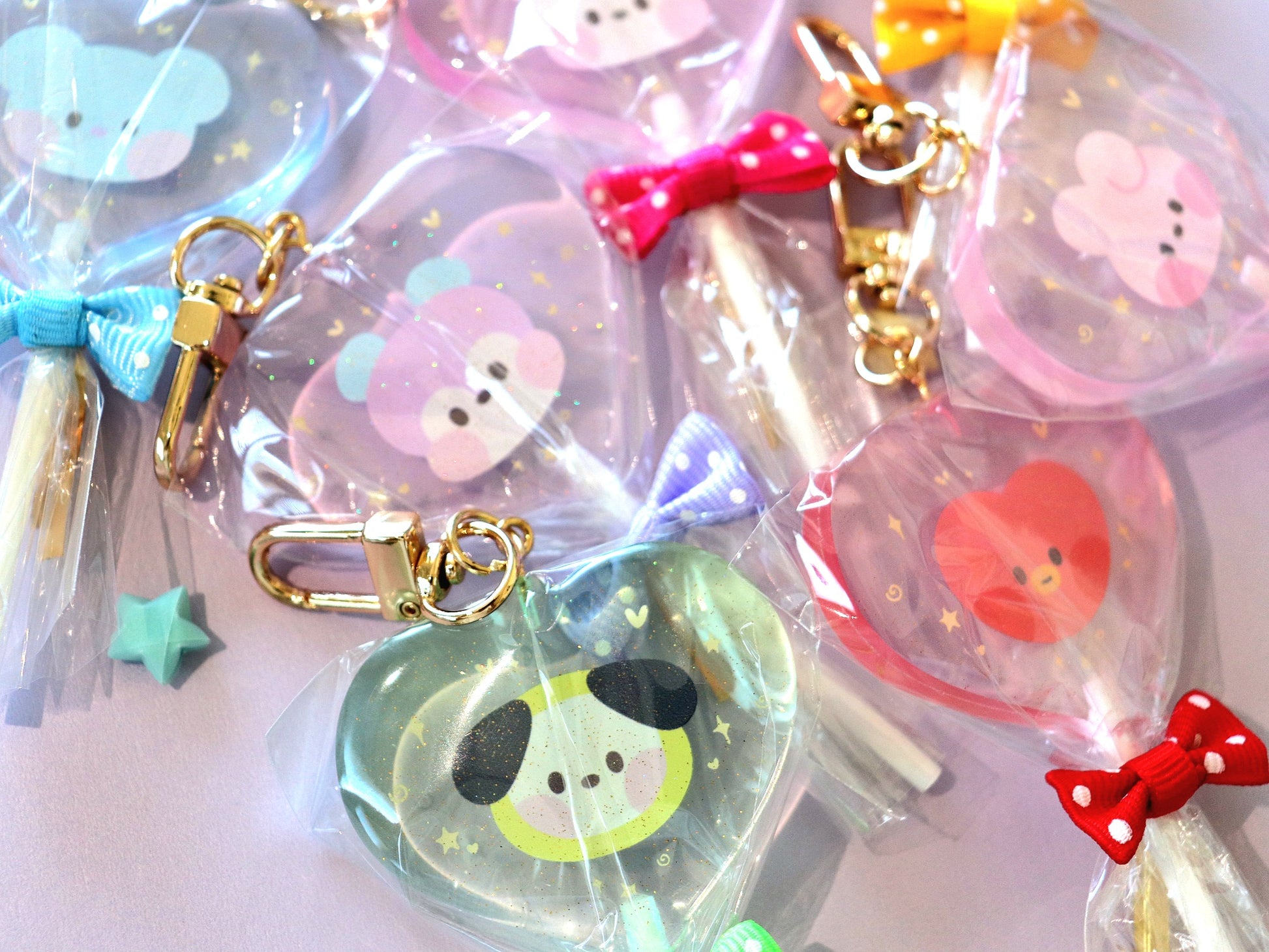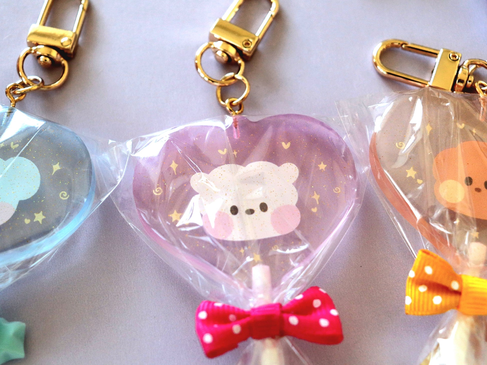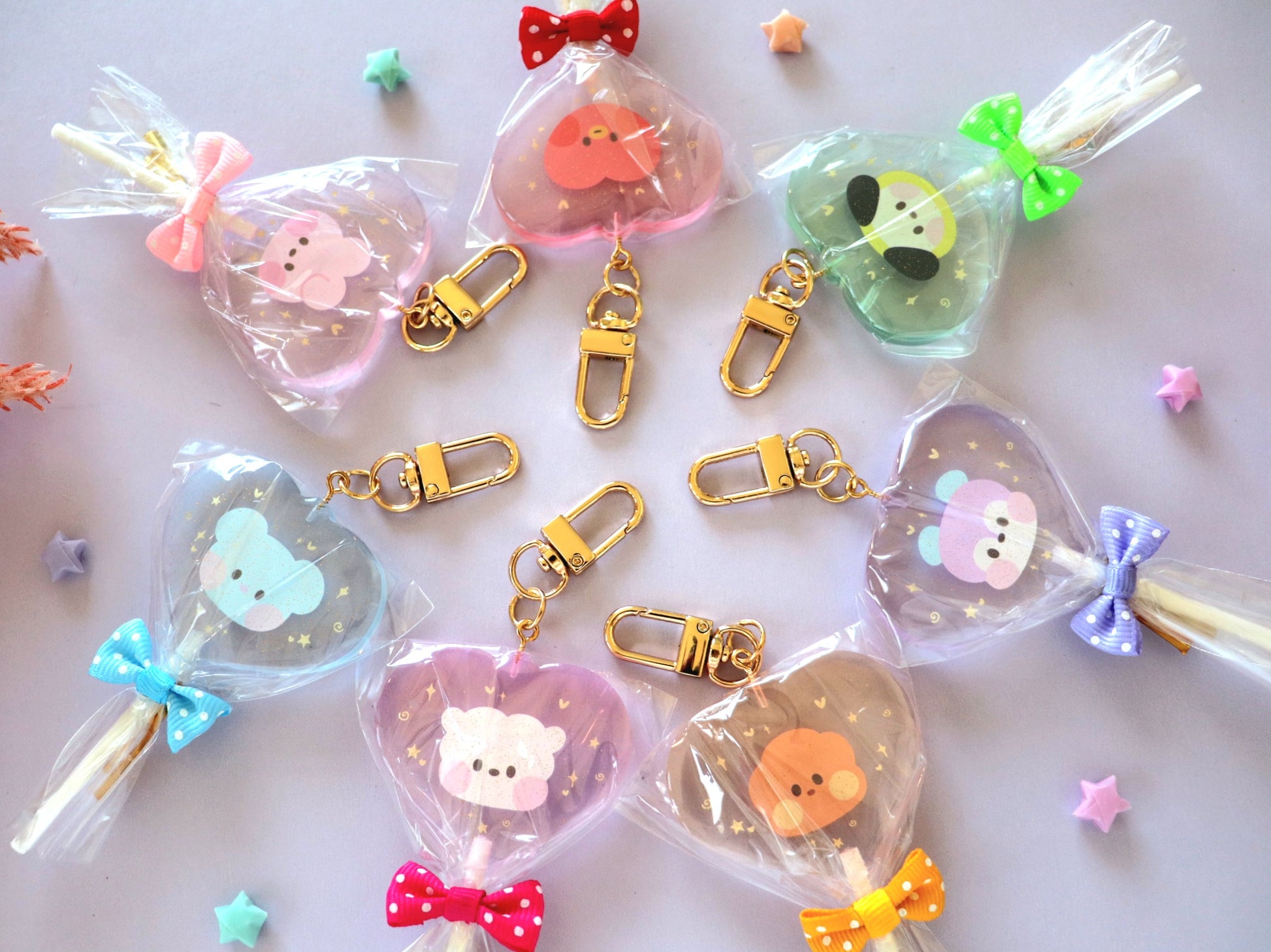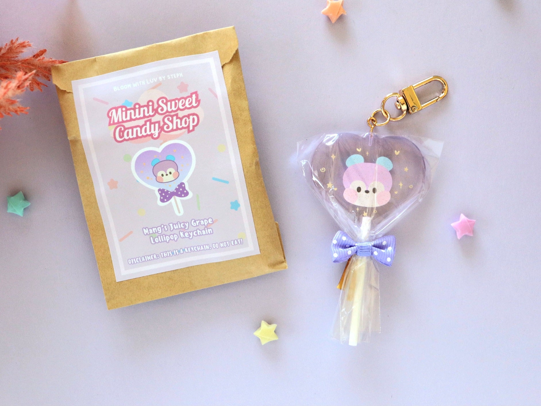 🍭 These cute and glittery keychains are each adorned with a matching bow! Each lollipop keychain is also packaged in a small brown candy shop-themed bag, especially perfect for gift giving!