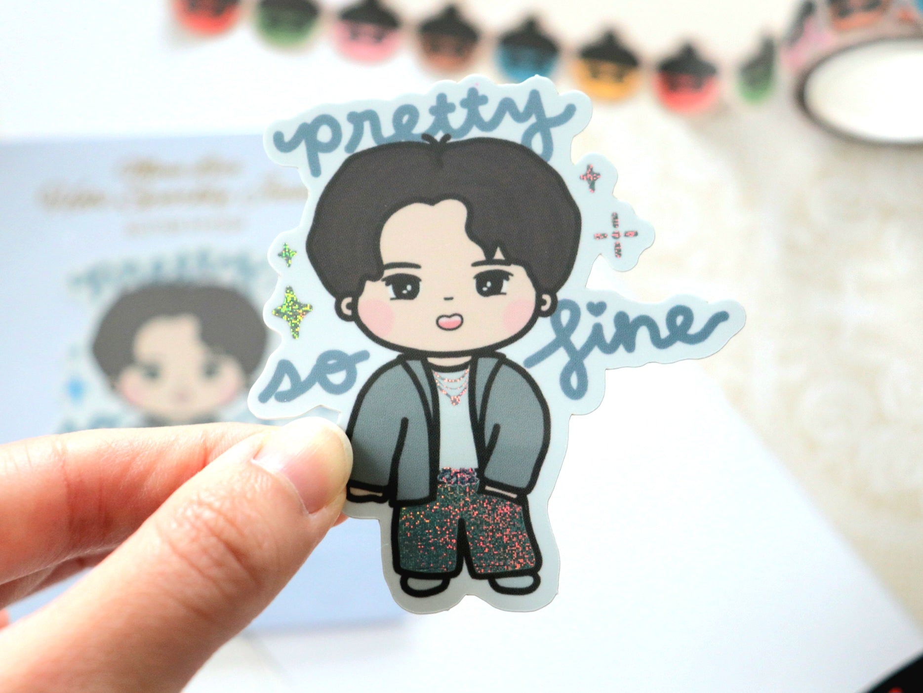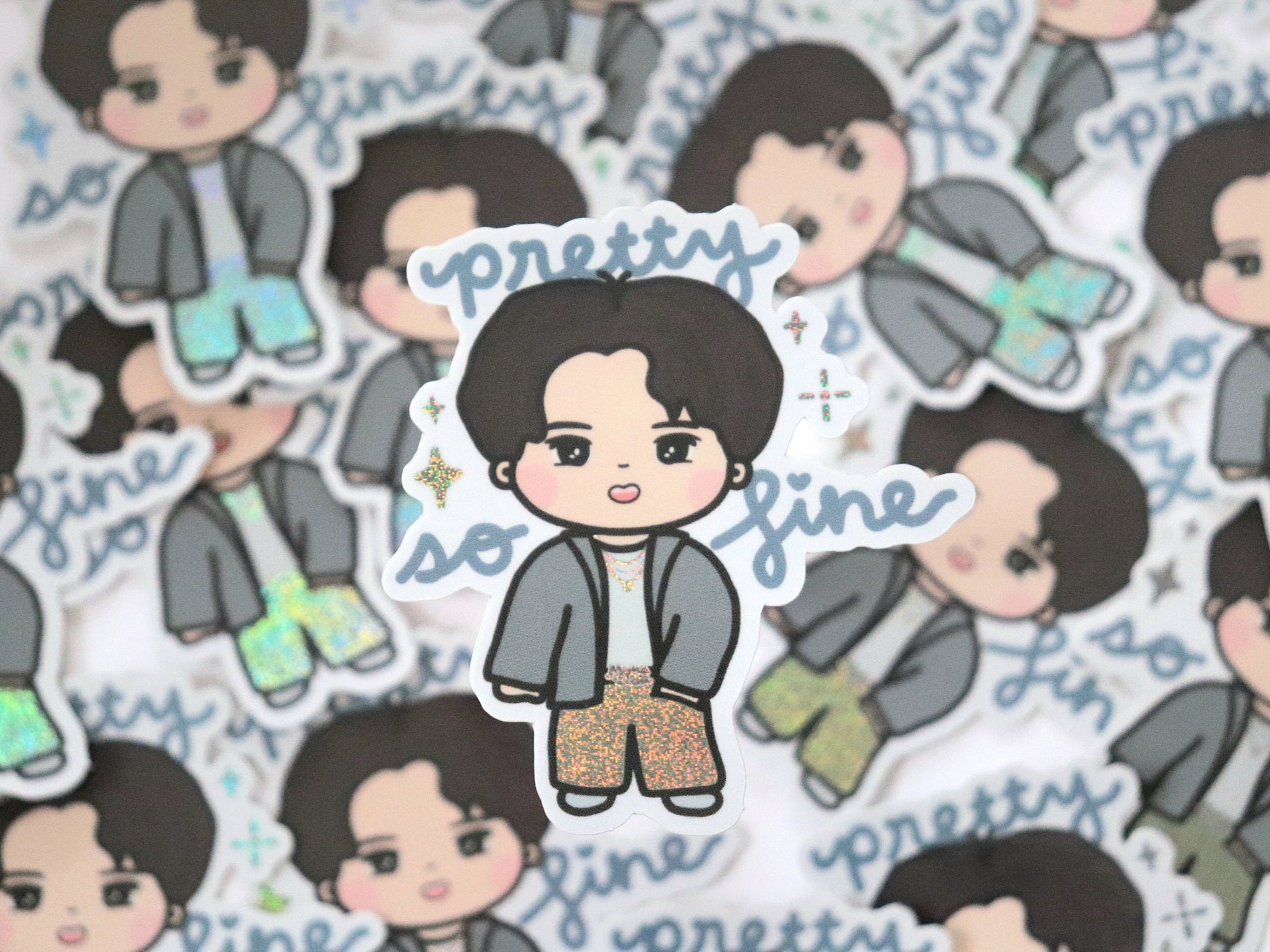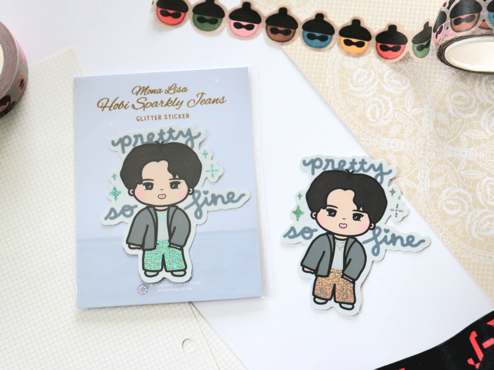 Hobi in his iconic sparkly jeans looking pretty, so fine! Inspired by his stage outfit and music video for Mona Lisa. This is a must-have for all the sparkly jeans enthusiasts!