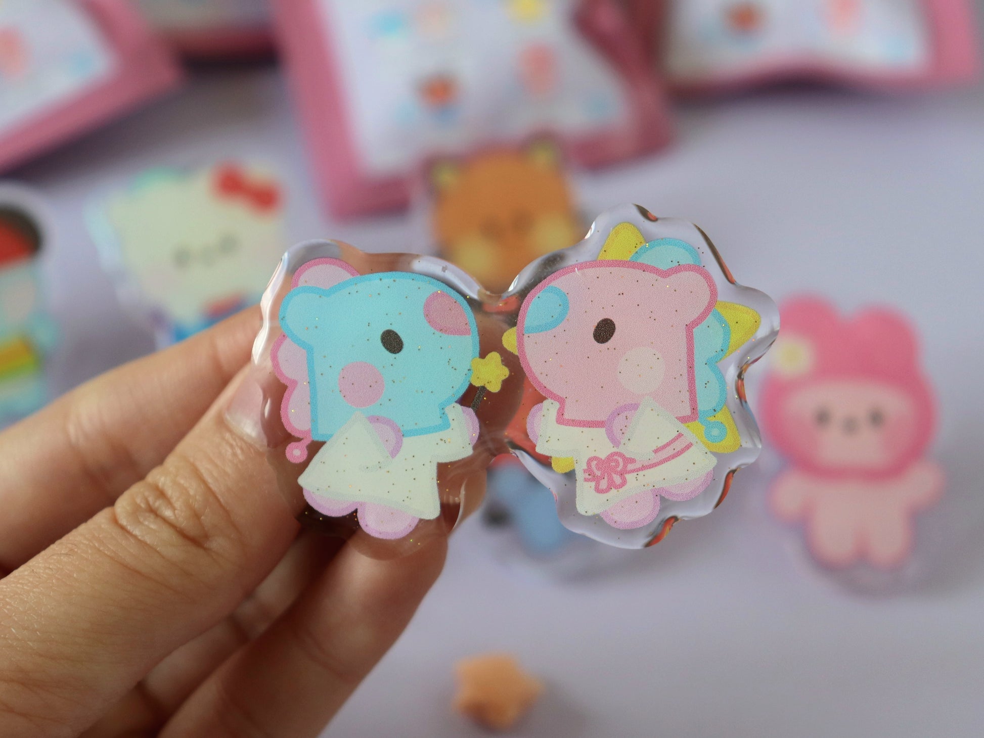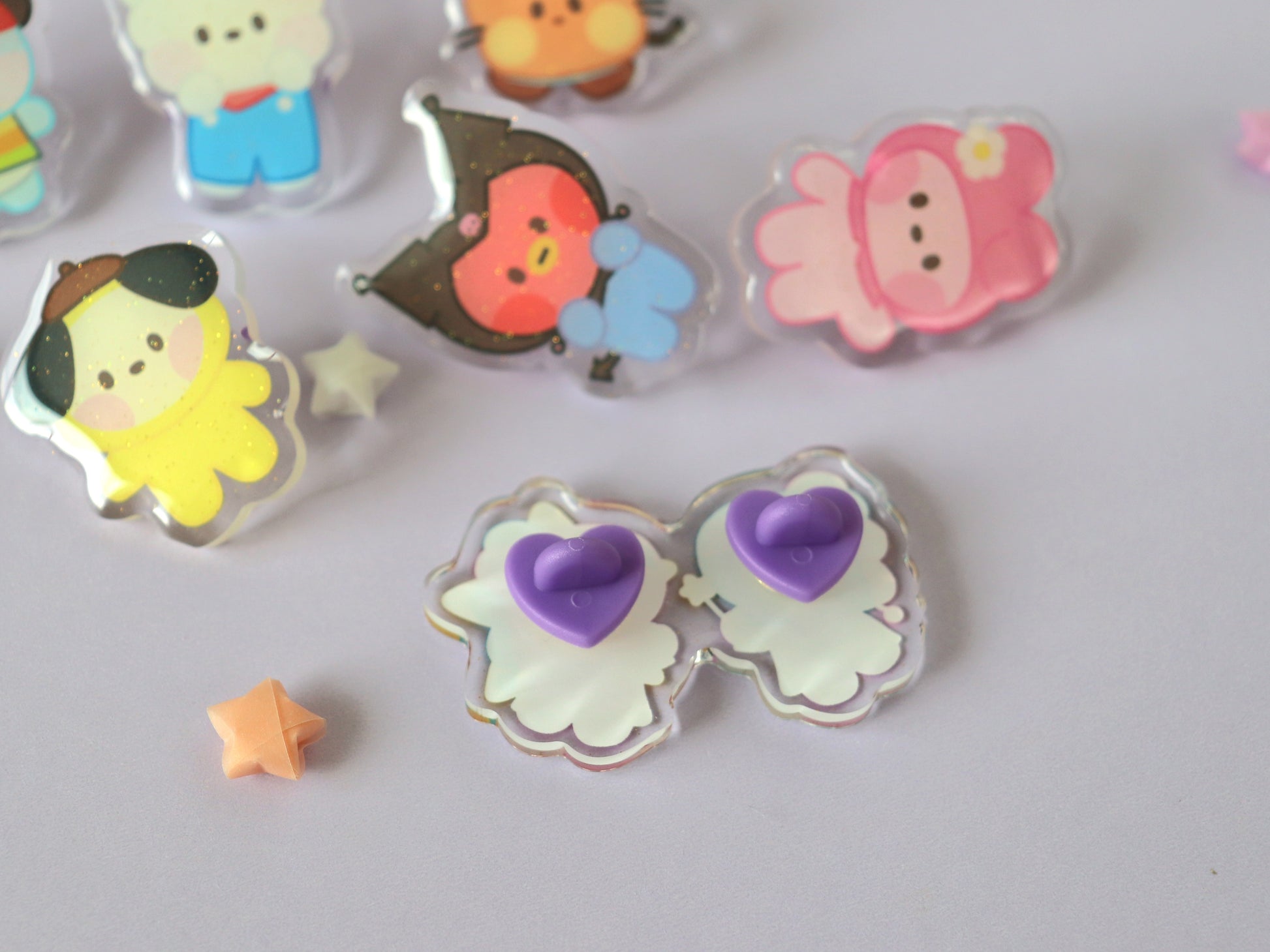 Get an adorable mini surprise with these blind bags, which includes 1 random acrylic glitter pin. Each has cute purple heart backings!