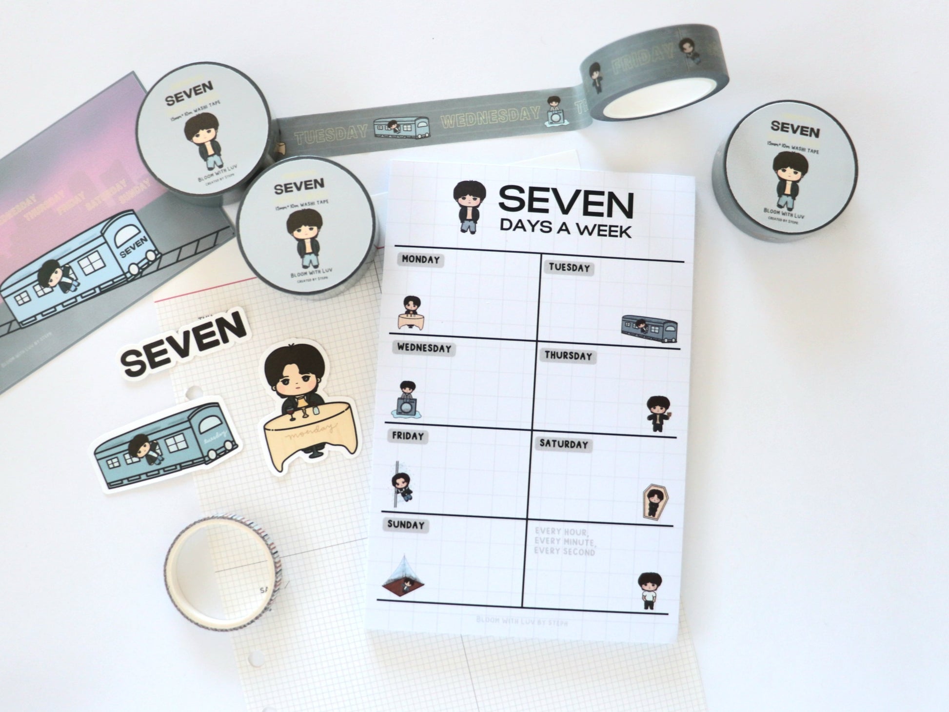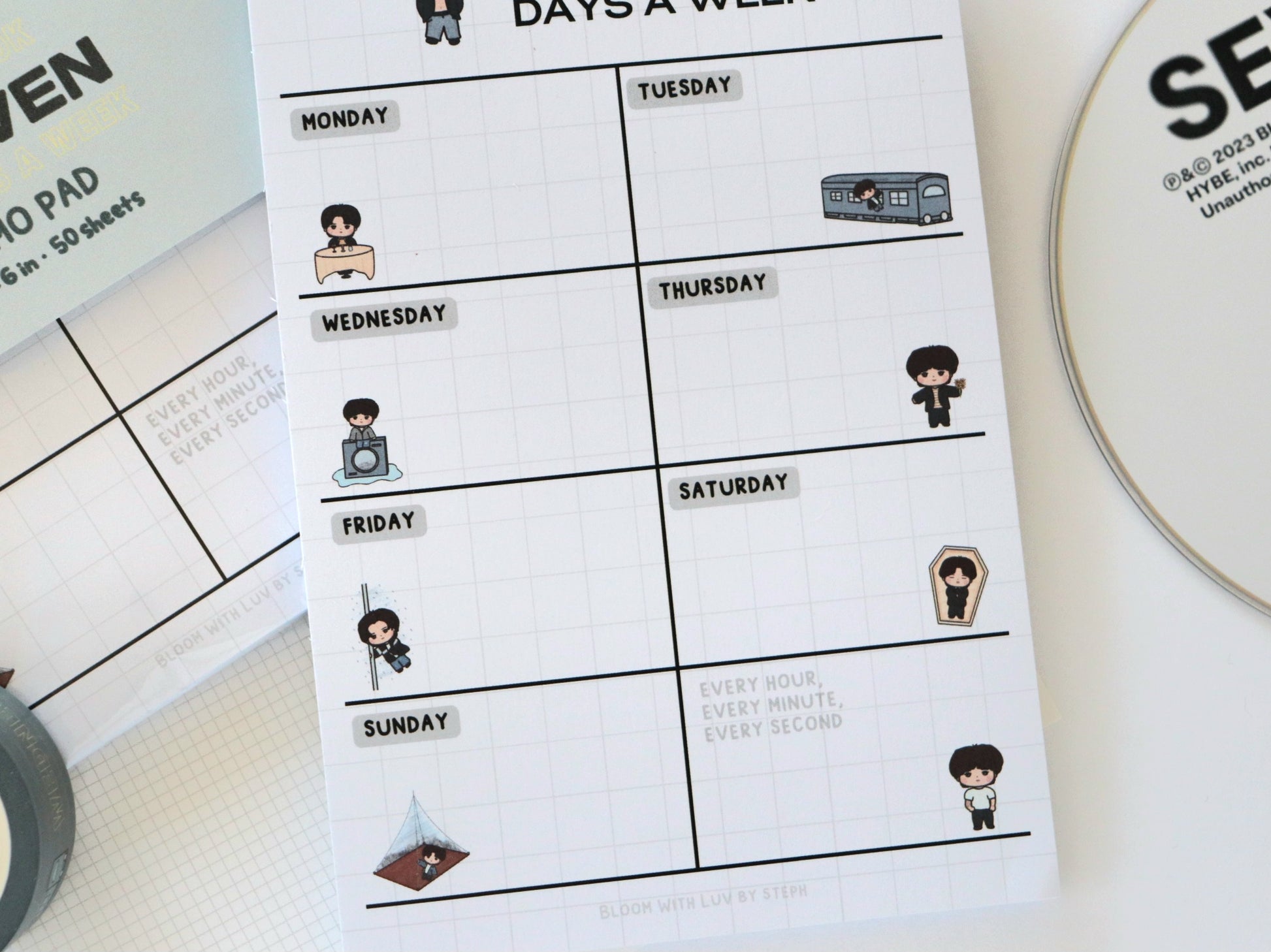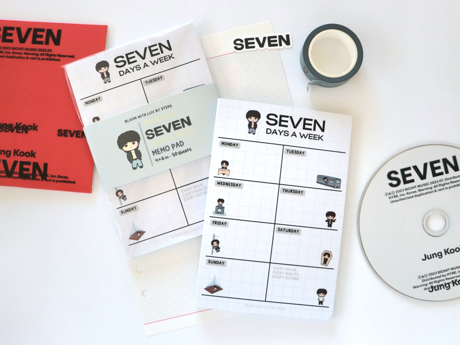 Plan your 7 days a week with this 4" x 6" memo pad featuring little Jungkook! It features little illustrations inspired by the Seven music video.