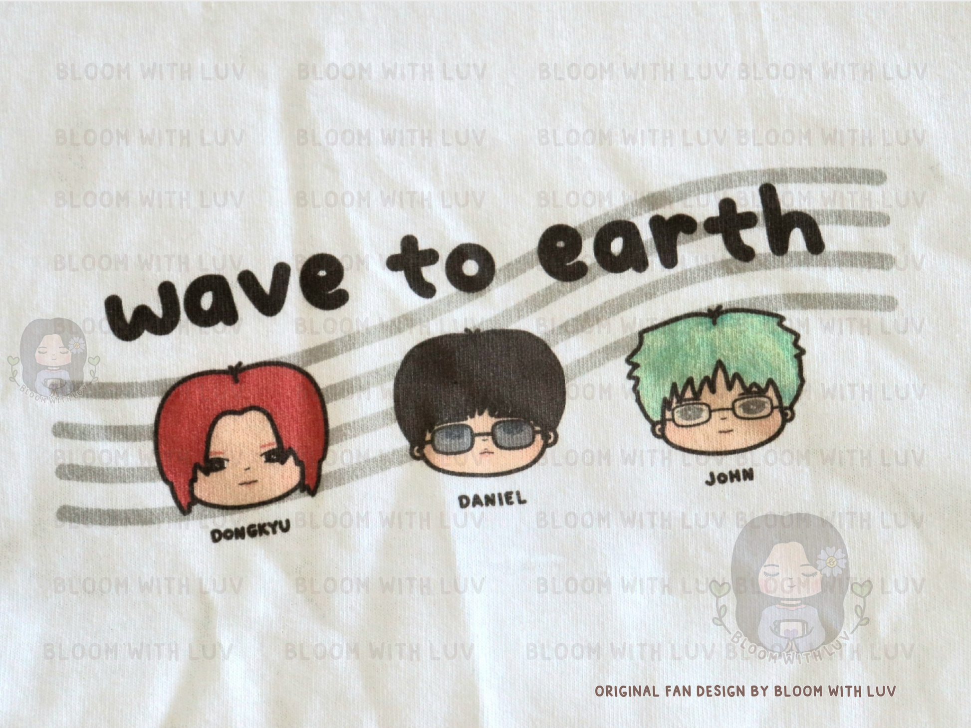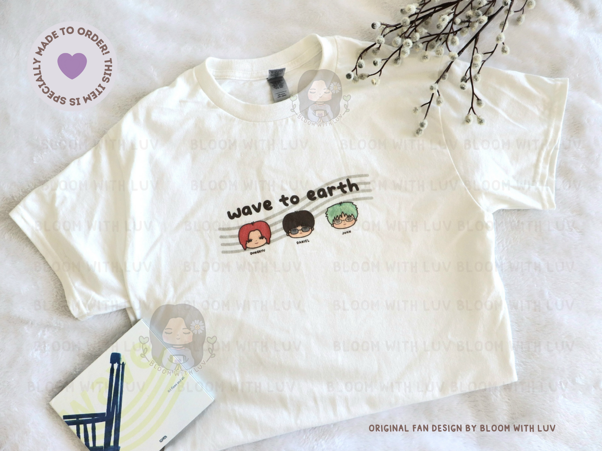 A cute and simple, classic fit white tee featuring chibi art of the Wave to Earth members: Daniel Kim, John Cha, and Dongkyu Shin.