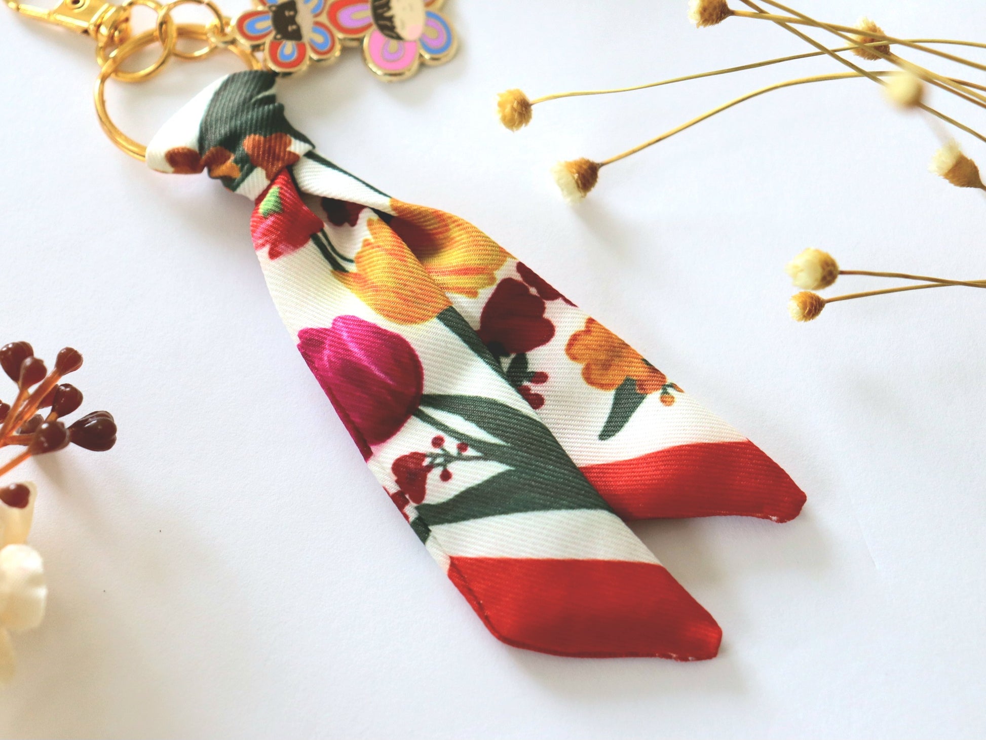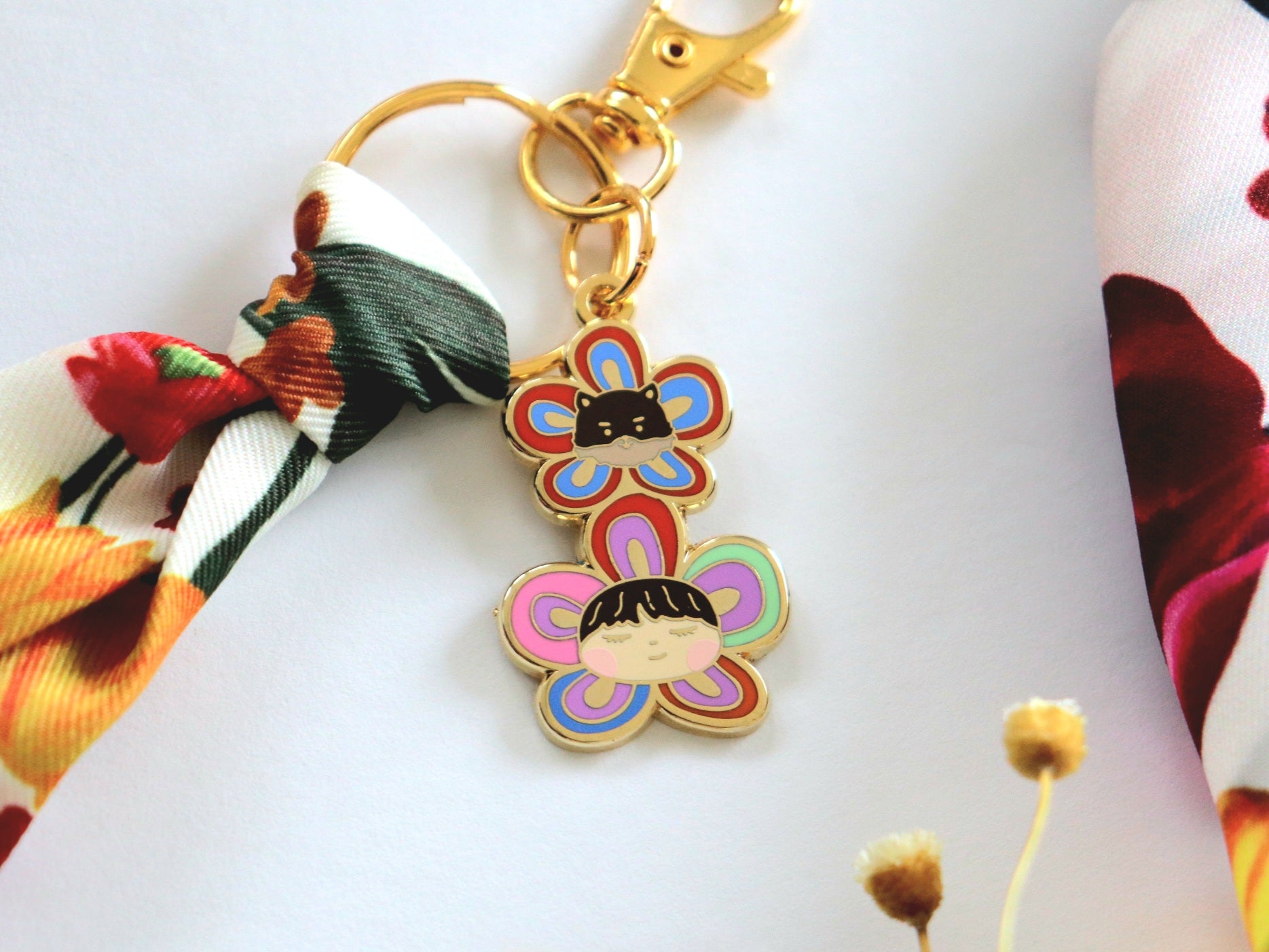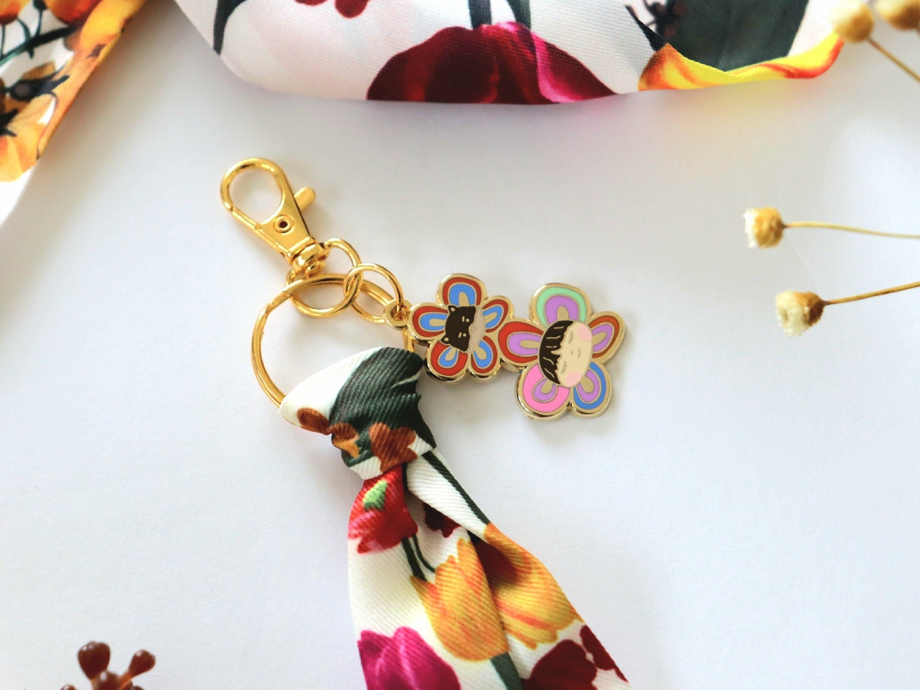 A cute and luxurious keychain inspired by Taehyung's Mute Boston bag twilly scarf and Flower Buddies brooches from the Artist Made Collection.
